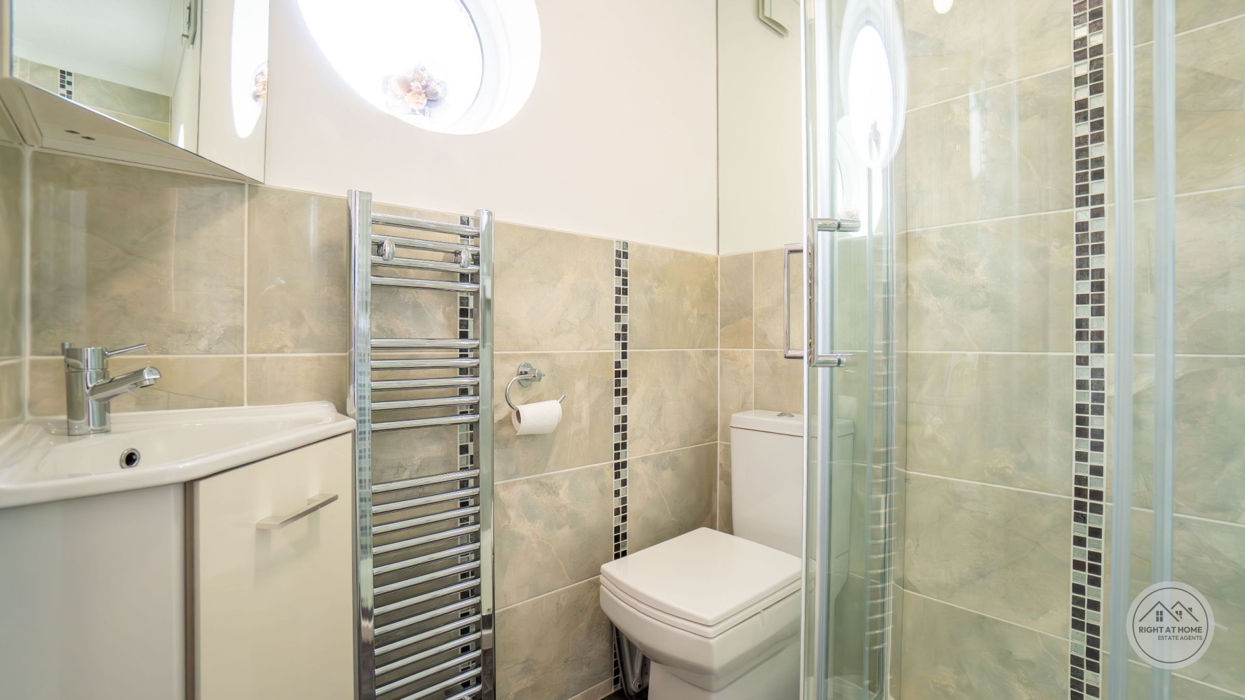 The accommodation includes two generously sized double bedrooms, both with fitted wardrobes. The principal bedroom features a chic en-suite shower room, while the fully tiled main bathroom serves the rest of the home in comfort and style.