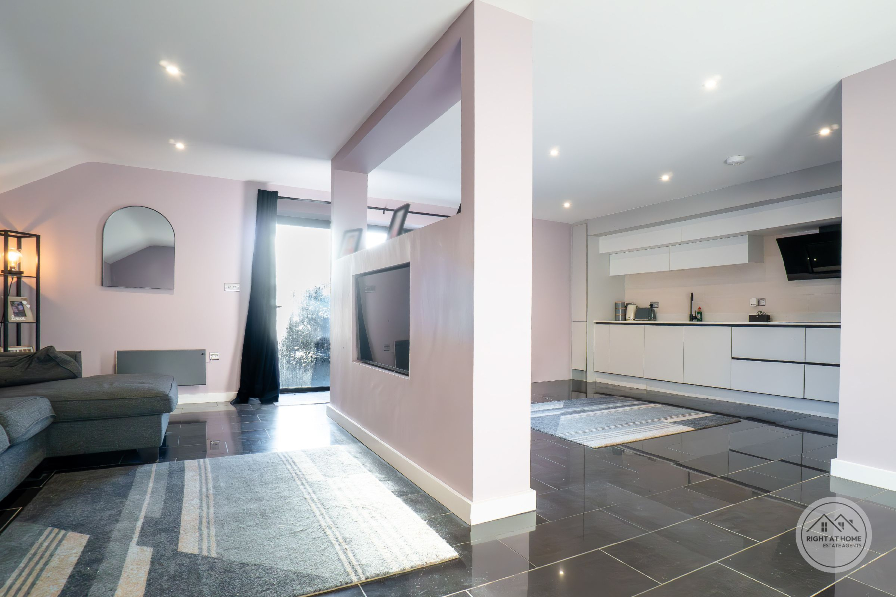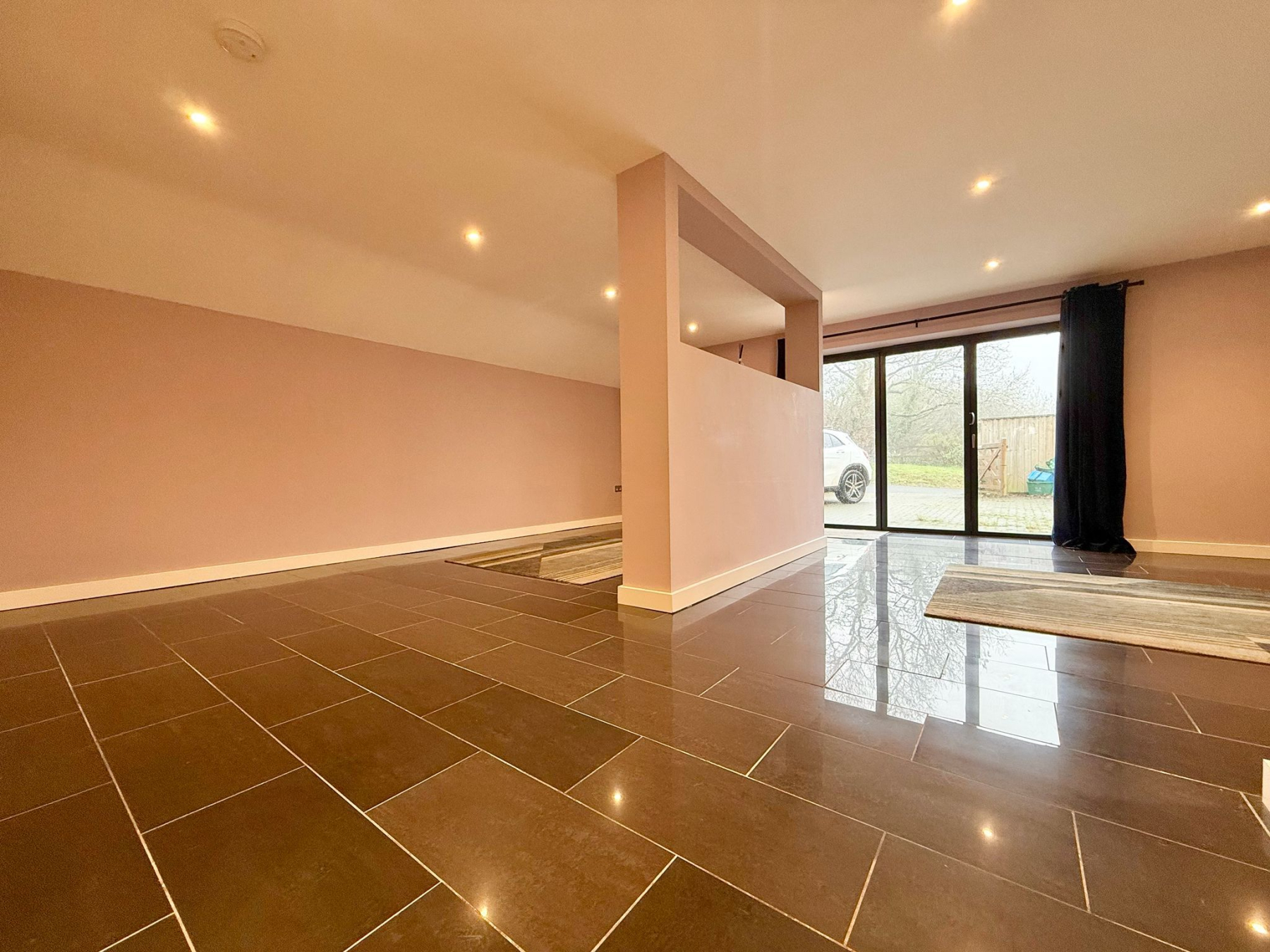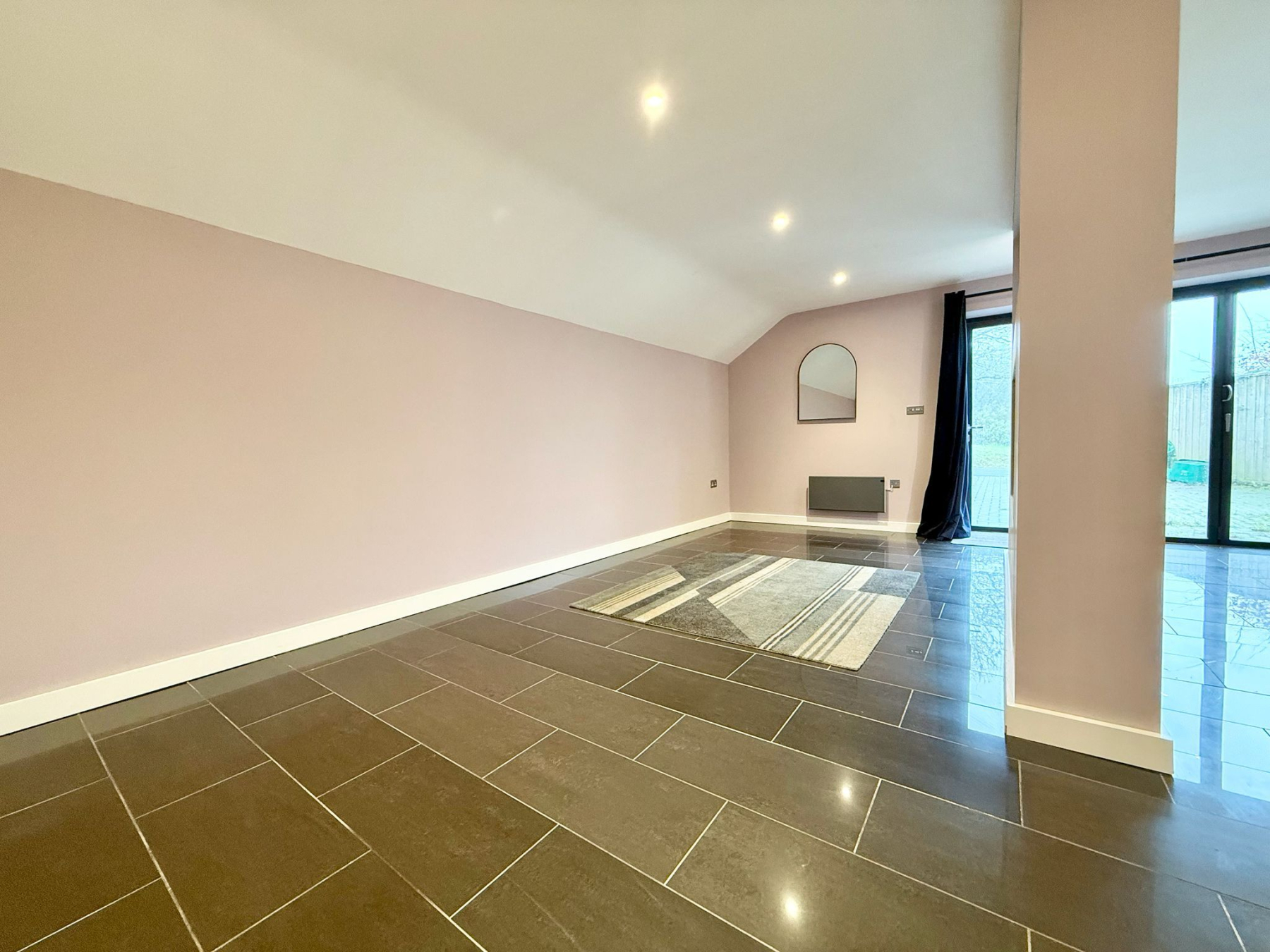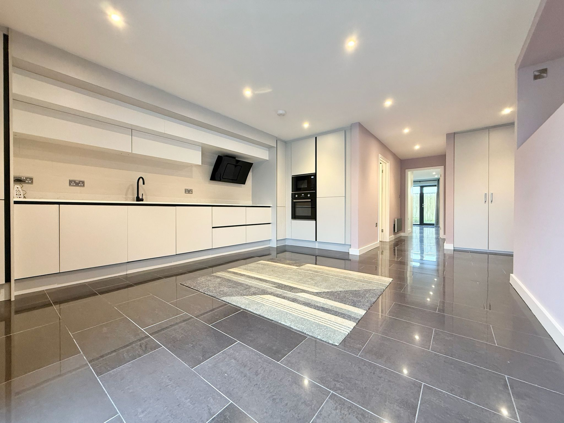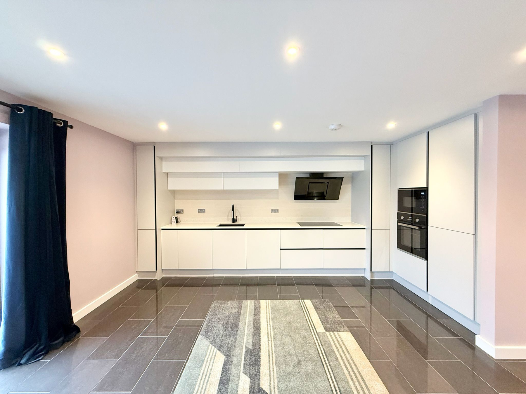 The heart of the home is an impressive open-plan living, kitchen and dining space, flooded with natural light and thoughtfully designed for both everyday living and entertaining. The kitchen is finished with sleek white fitted units providing excellent storage, complemented by integrated appliances including a double oven and an induction hob with extractor. Full-height windows and glazed doors create a seamless connection to the rear courtyard, enhancing the sense of space and light throughout.