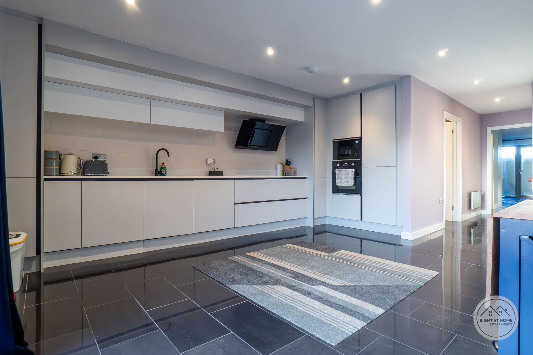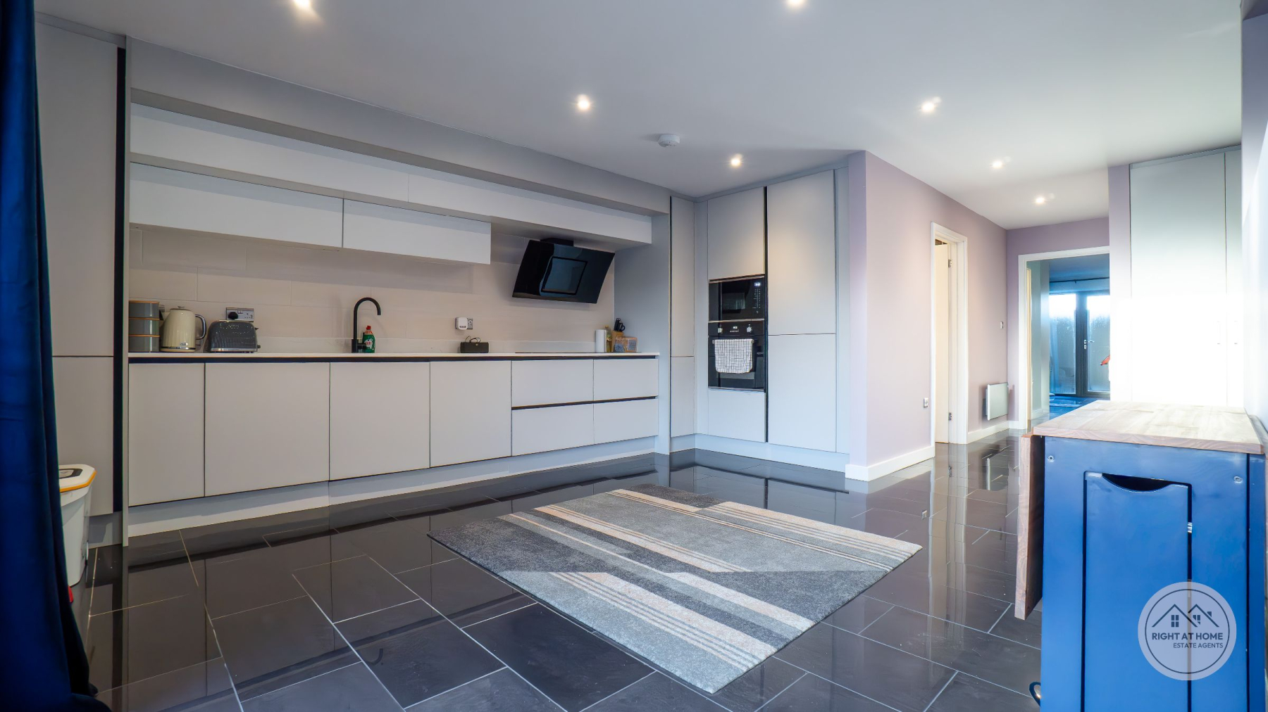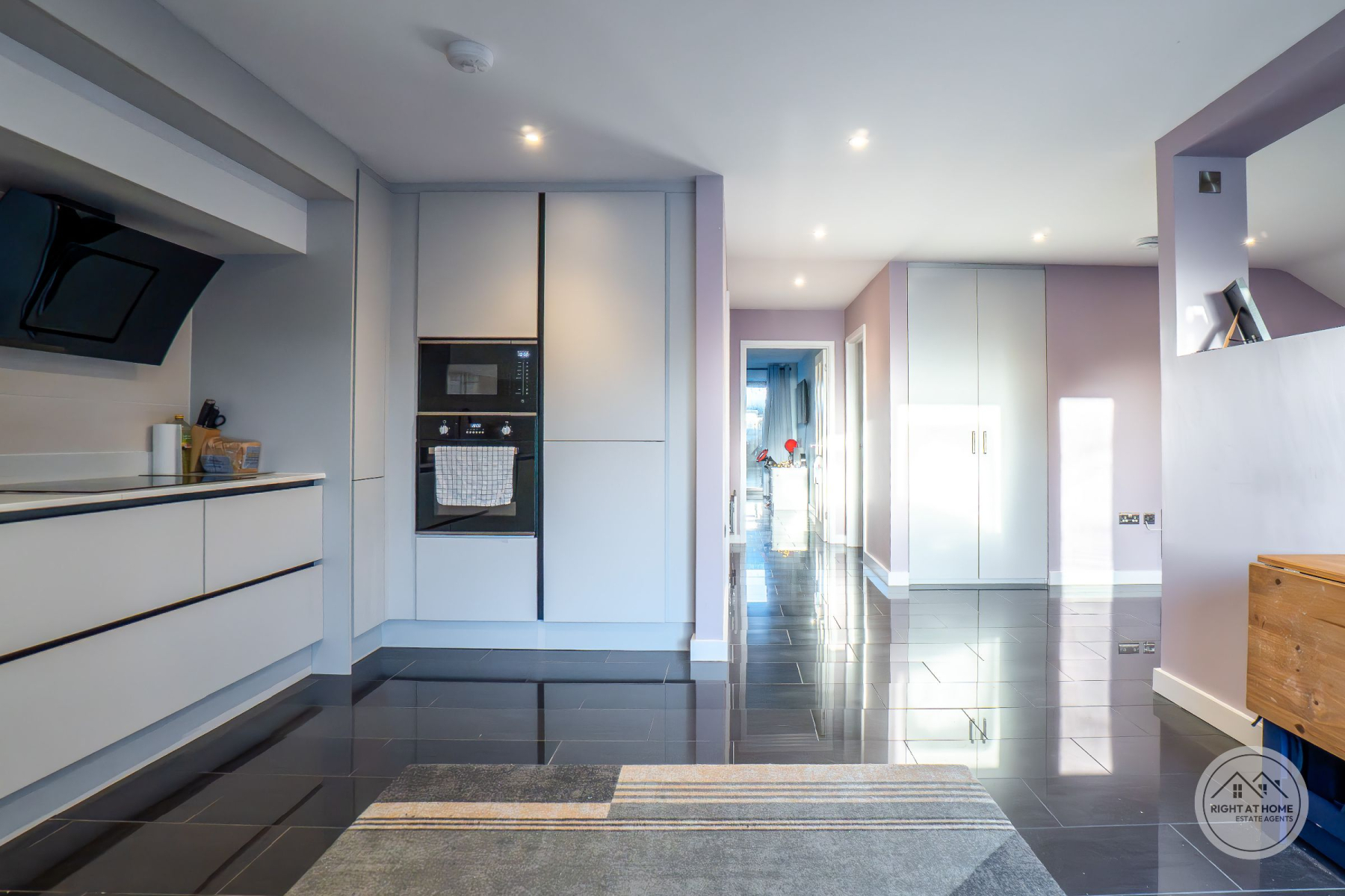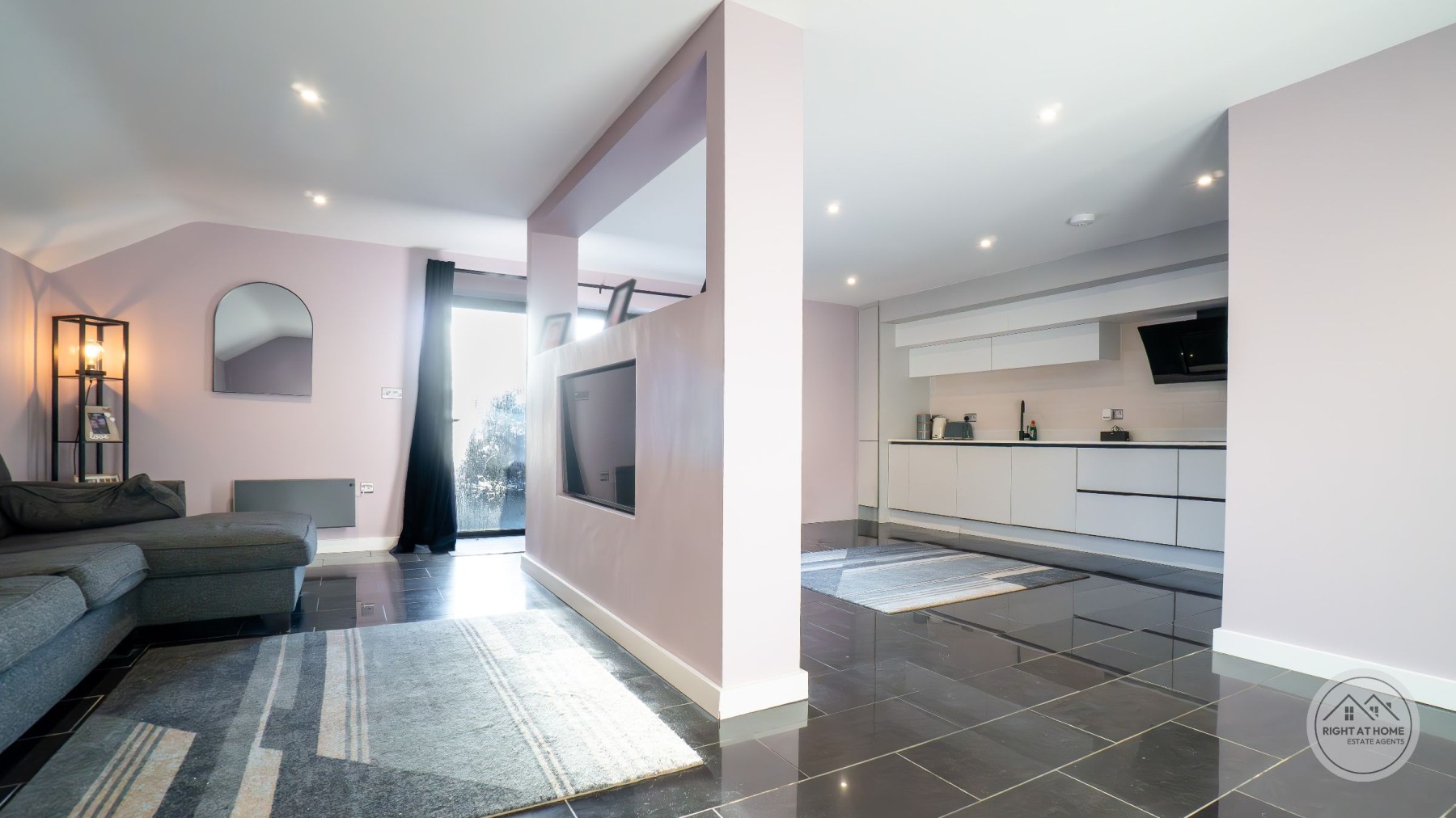 The heart of the home is an impressive open-plan living, kitchen and dining space, flooded with natural light and thoughtfully designed for both everyday living and entertaining. The kitchen is finished with sleek white fitted units providing excellent storage, complemented by integrated appliances including a double oven and an induction hob with extractor. Full-height windows and glazed doors create a seamless connection to the rear courtyard, enhancing the sense of space and light throughout.