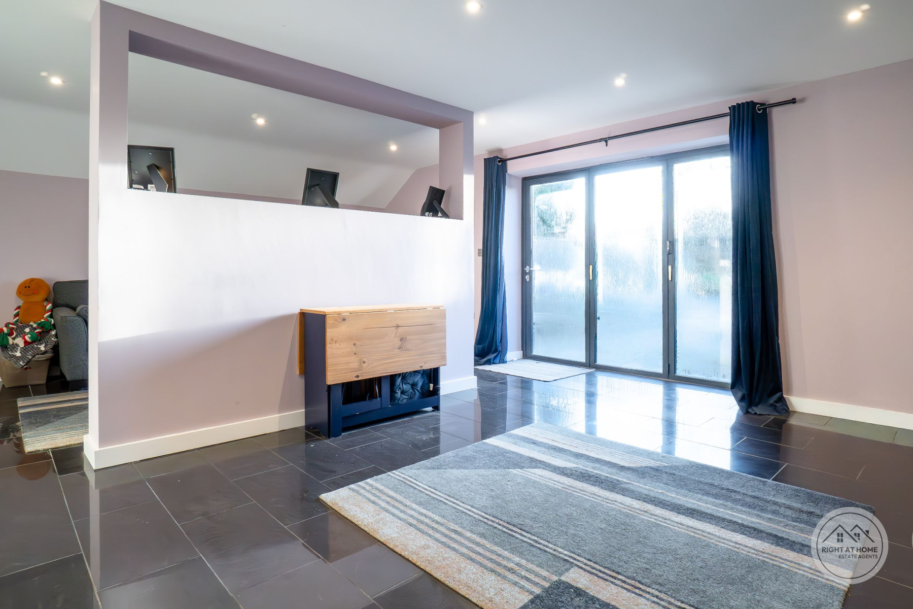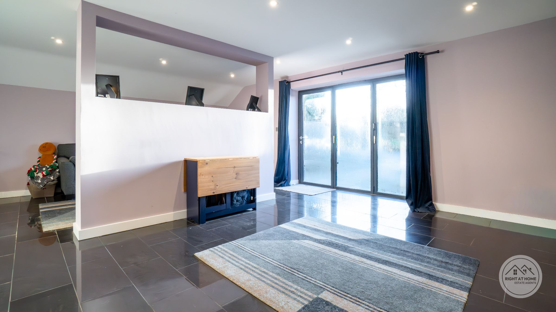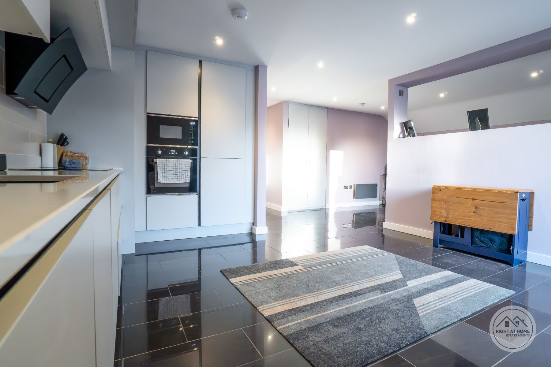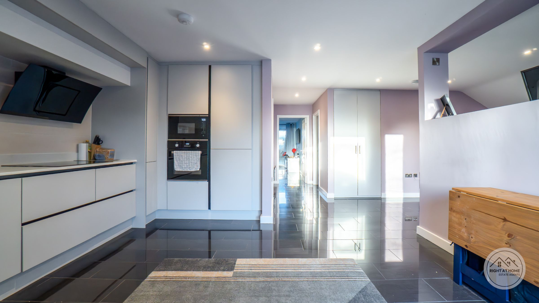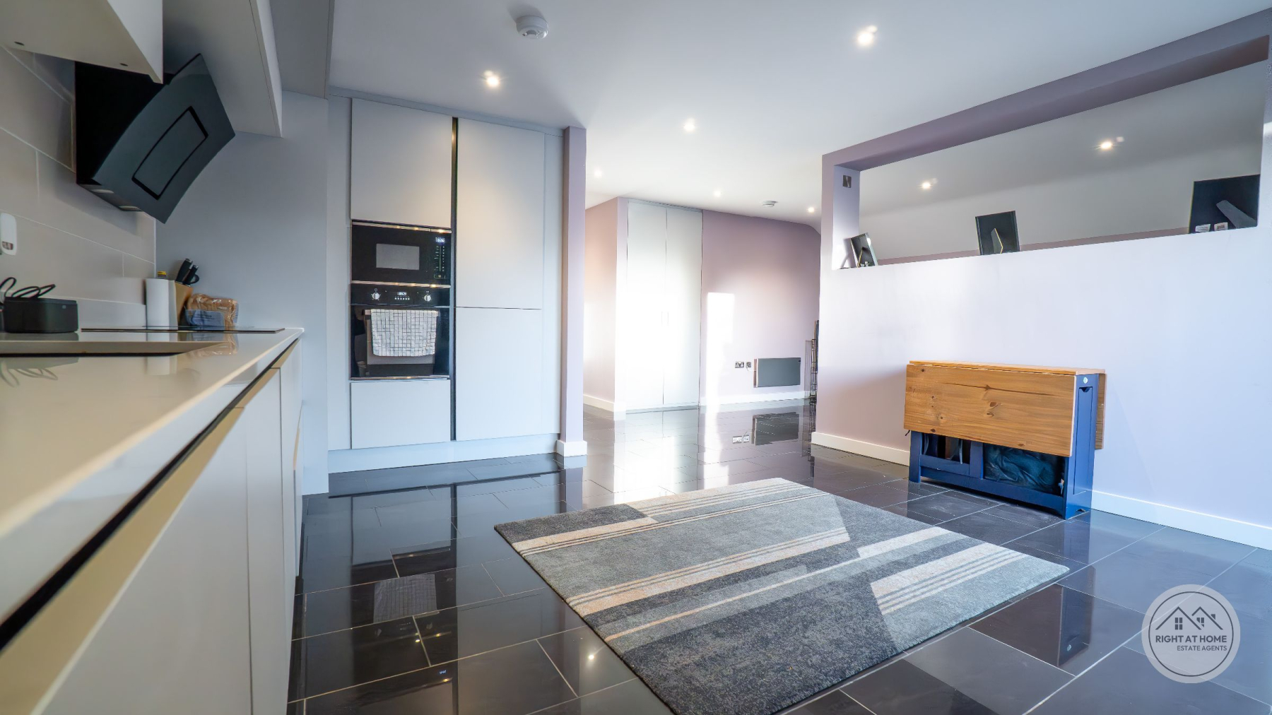 The heart of the home is an impressive open-plan living, kitchen and dining space, flooded with natural light and thoughtfully designed for both everyday living and entertaining. The kitchen is finished with sleek white fitted units providing excellent storage, complemented by integrated appliances including a double oven and an induction hob with extractor. Full-height windows and glazed doors create a seamless connection to the rear courtyard, enhancing the sense of space and light throughout.