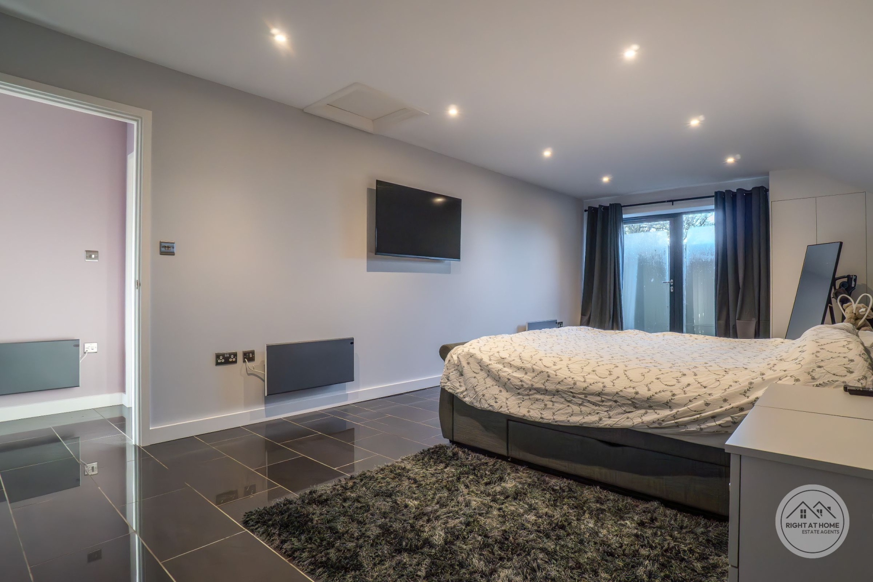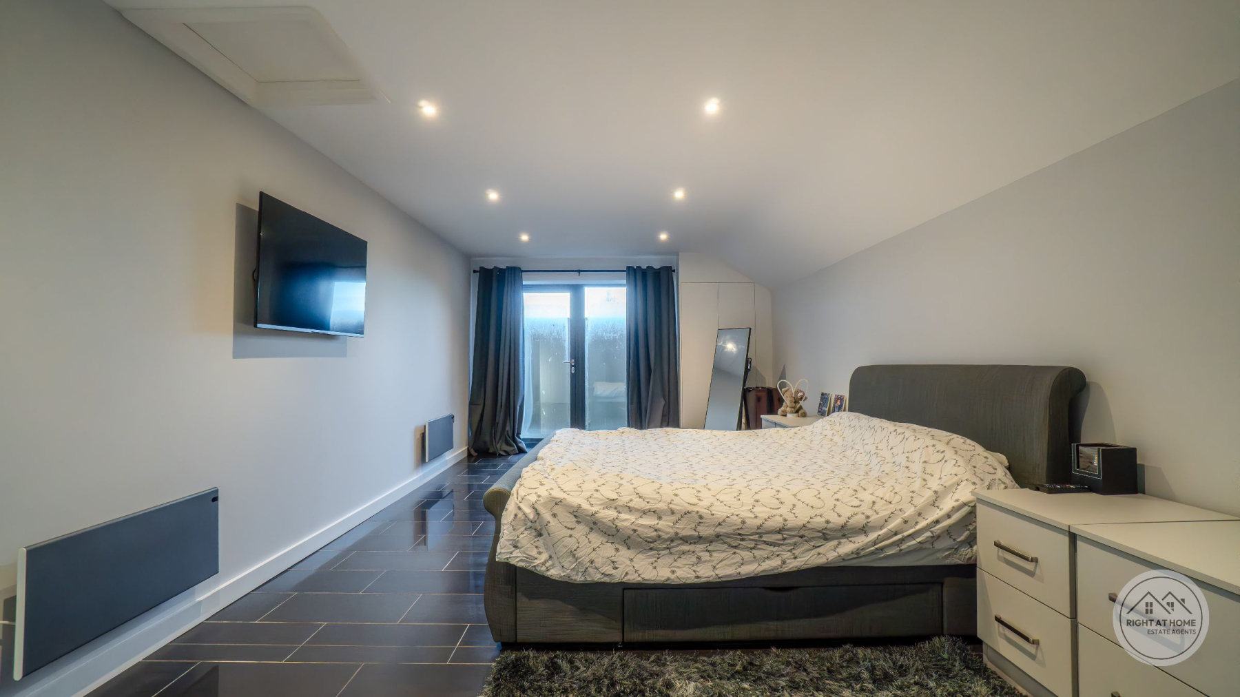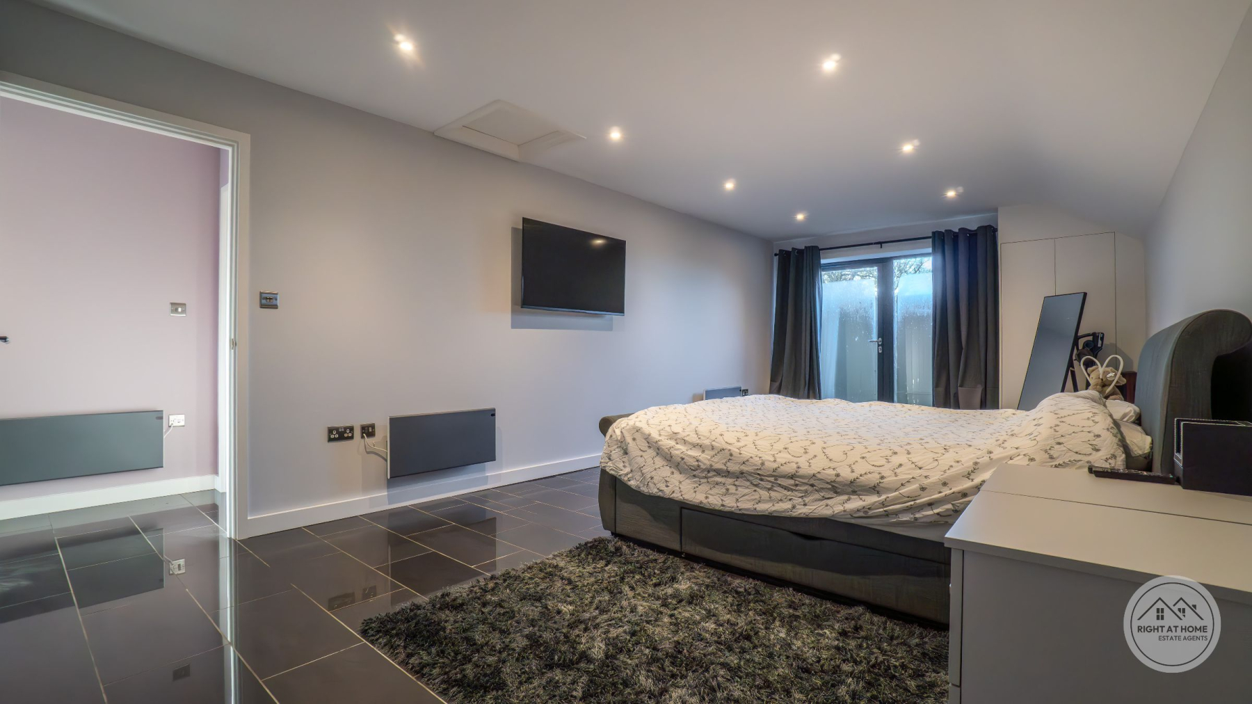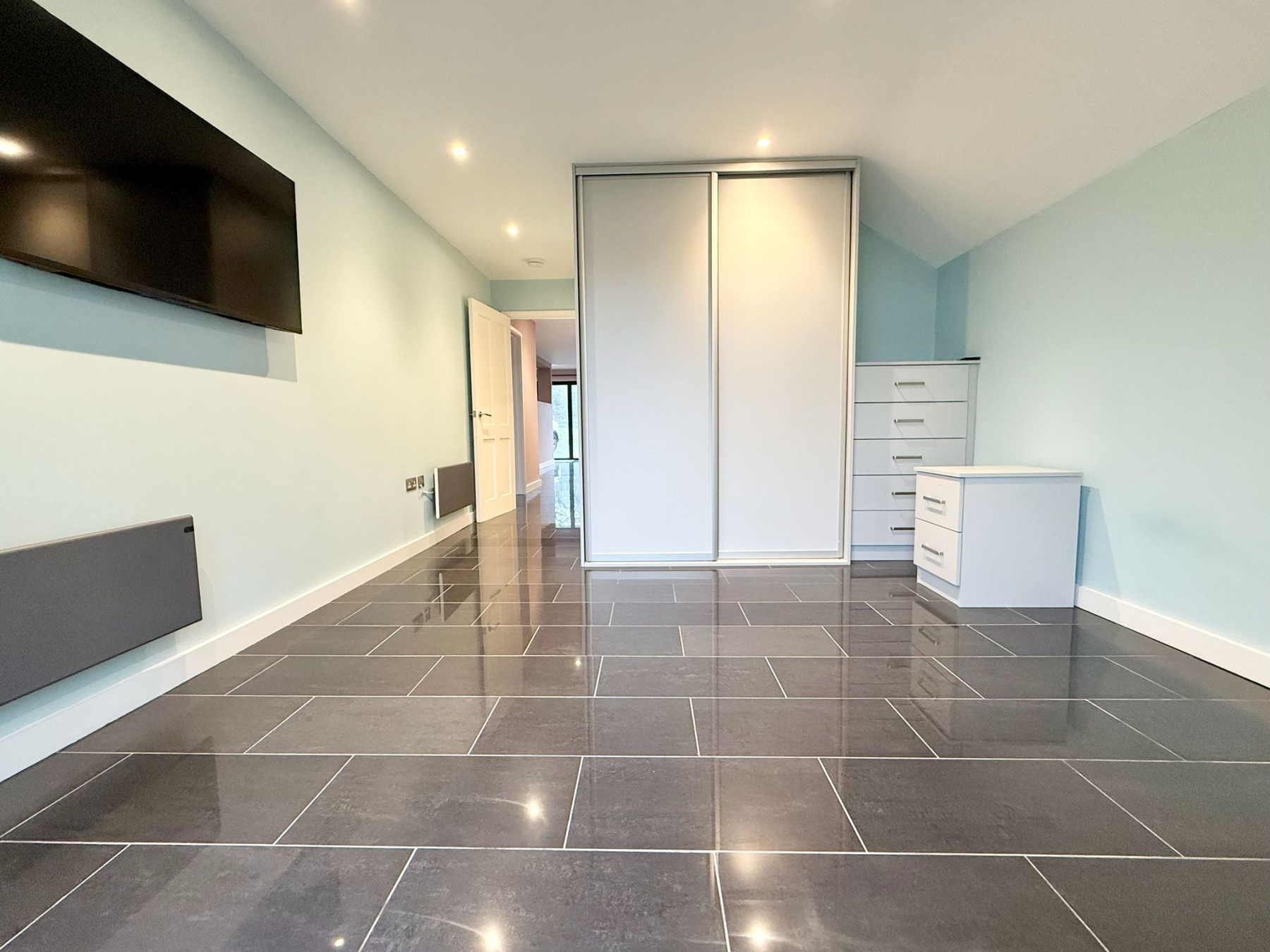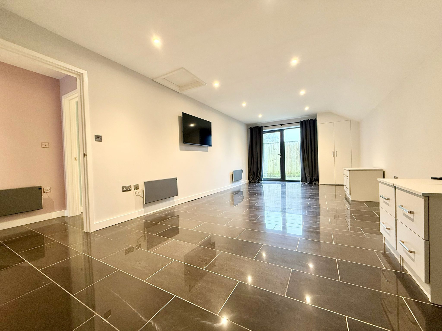 The property offers two generously proportioned bedrooms, both benefiting from built-in wardrobes and direct access to the rear courtyard via full-height glazing. The principal bedroom enjoys the additional luxury of a stylish en-suite shower room, while the second bedroom is particularly impressive in scale, extending to approximately 25ft and offering excellent versatility. A separate family shower room serves guests and the second bedroom, finished with contemporary suites including low-level WC, pedestal washbasin and rainfall shower head. Further features include attic access via the principal bedroom, private drainage, solar panels and an electric vehicle charging point, adding to the home's modern efficiency and sustainability credentials. The property is also offered with no onward chain, ensuring a straightforward purchase.