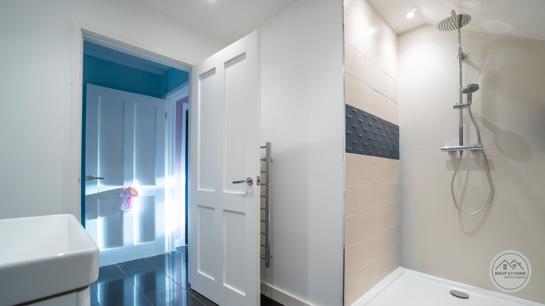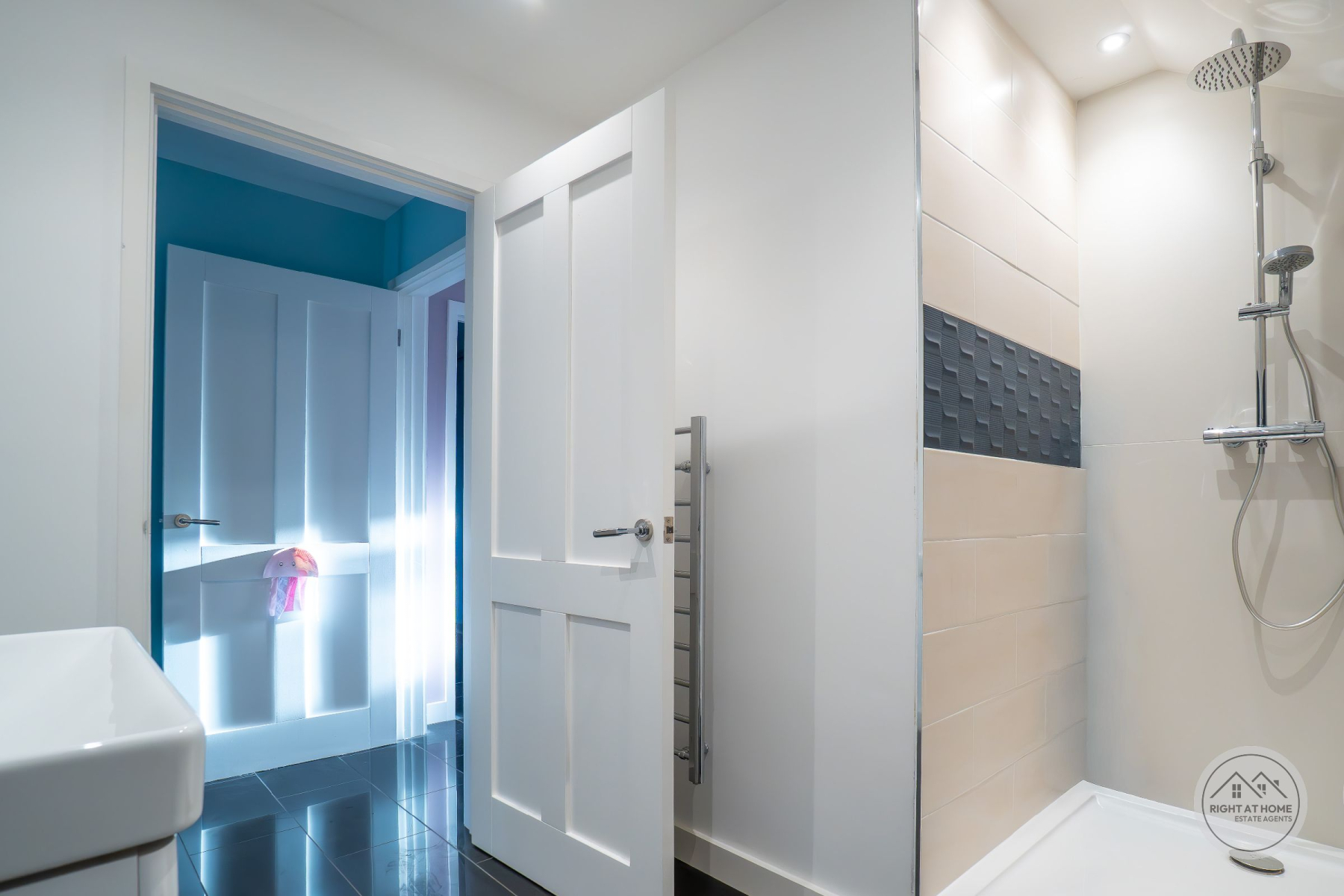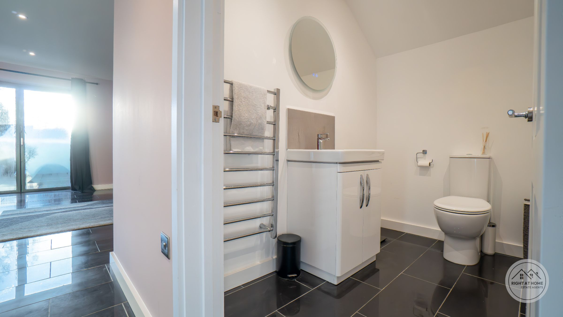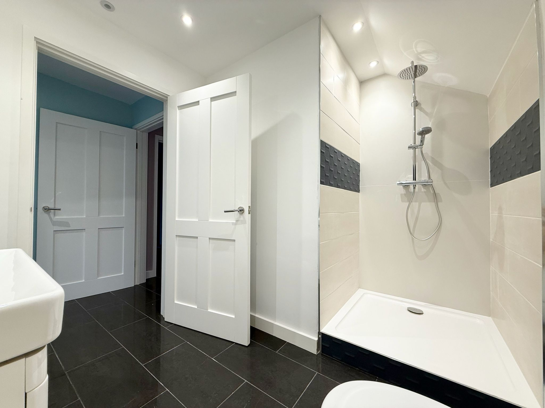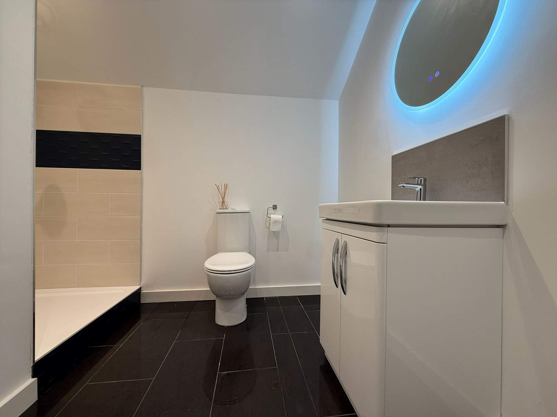 The property offers two generously proportioned bedrooms, both benefiting from built-in wardrobes and direct access to the rear courtyard via full-height glazing. The principal bedroom enjoys the additional luxury of a stylish en-suite shower room, while the second bedroom is particularly impressive in scale, extending to approximately 25ft and offering excellent versatility. A separate family shower room serves guests and the second bedroom, finished with contemporary suites including low-level WC, pedestal washbasin and rainfall shower head. Further features include attic access via the principal bedroom, private drainage, solar panels and an electric vehicle charging point, adding to the home's modern efficiency and sustainability credentials. The property is also offered with no onward chain, ensuring a straightforward purchase.
