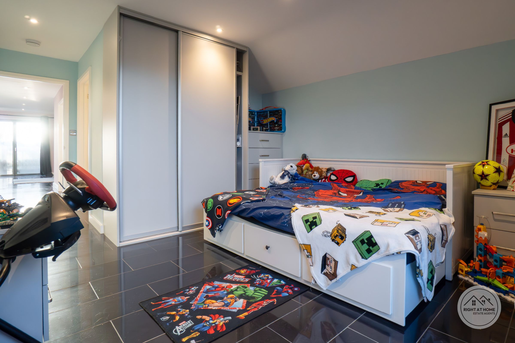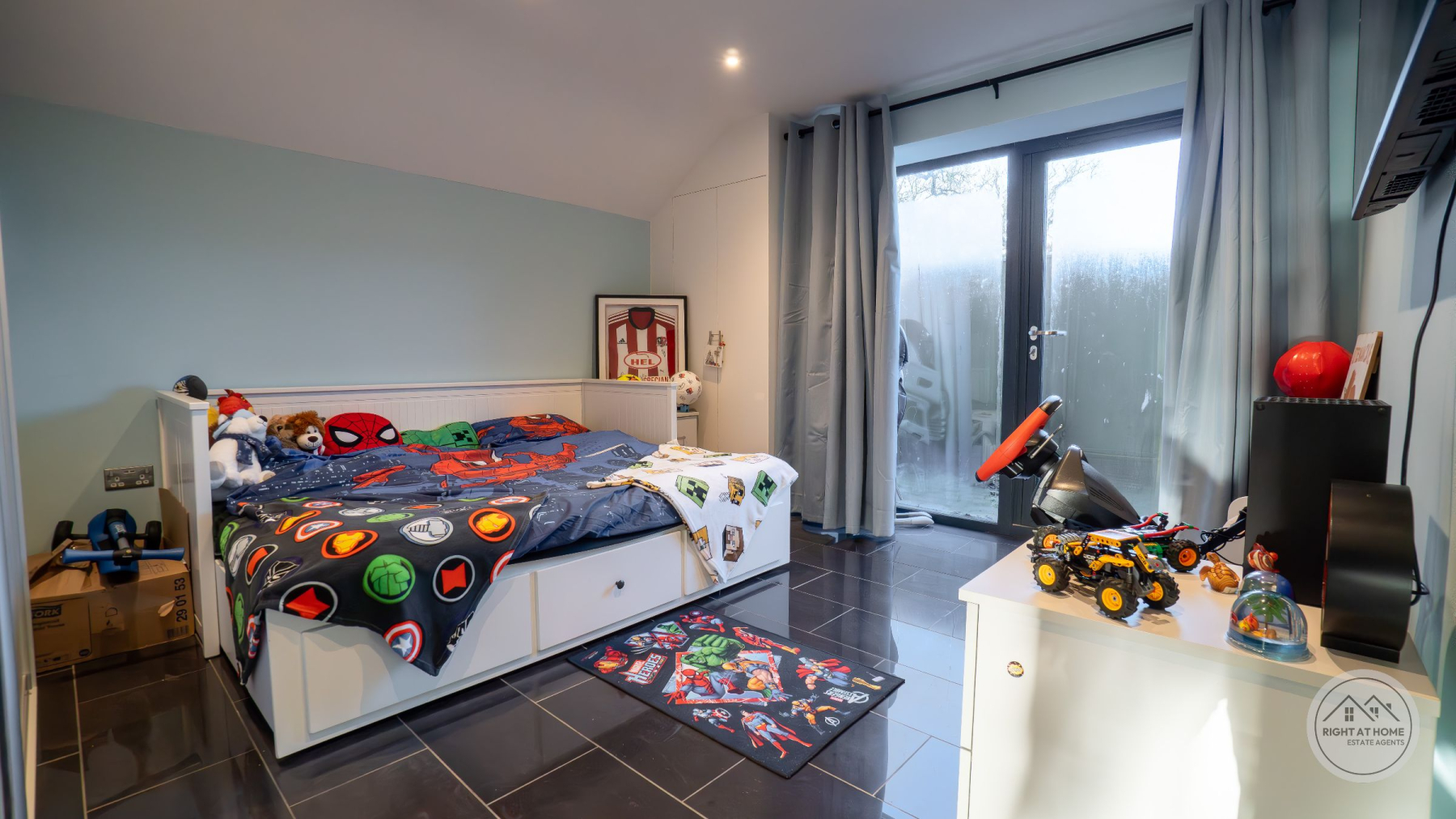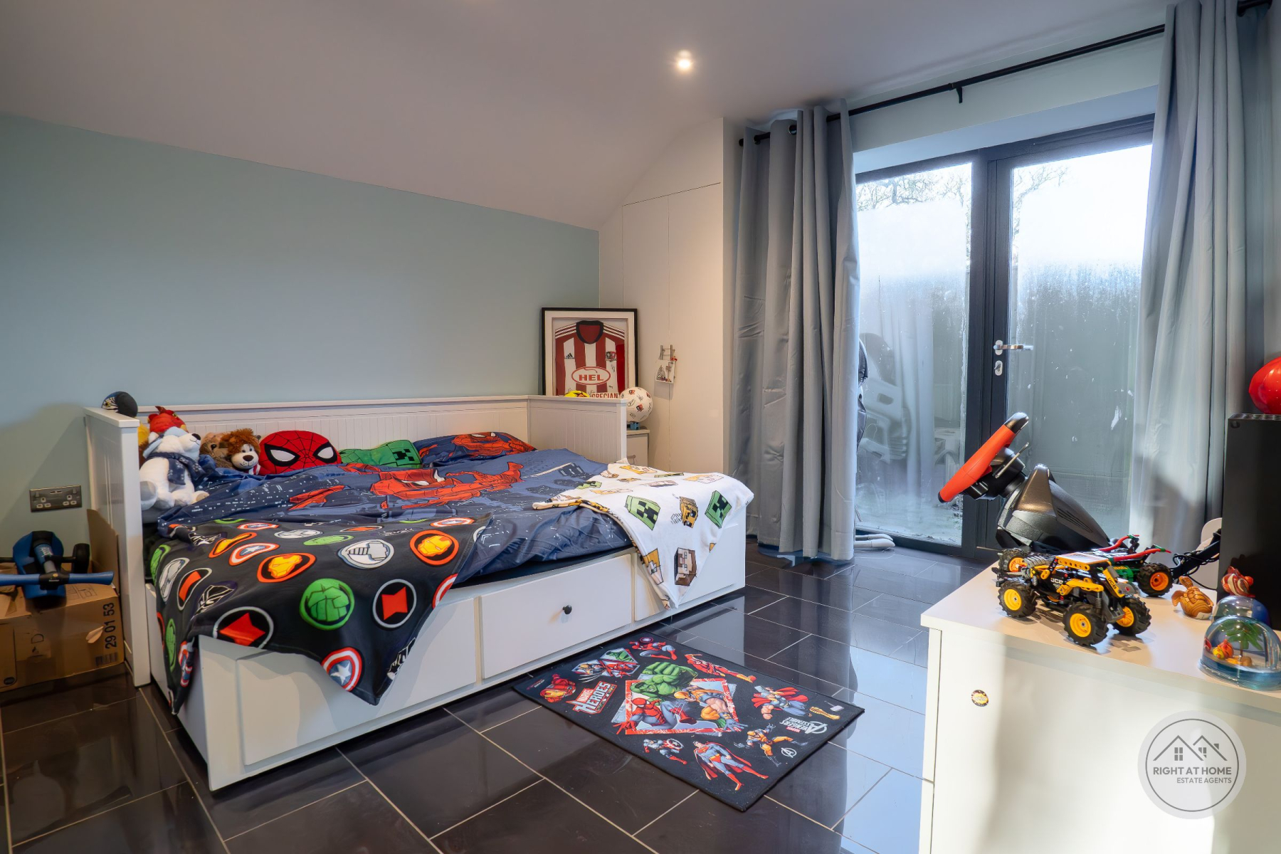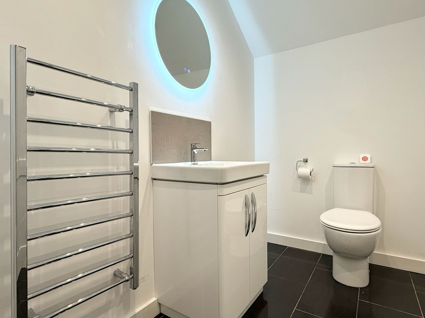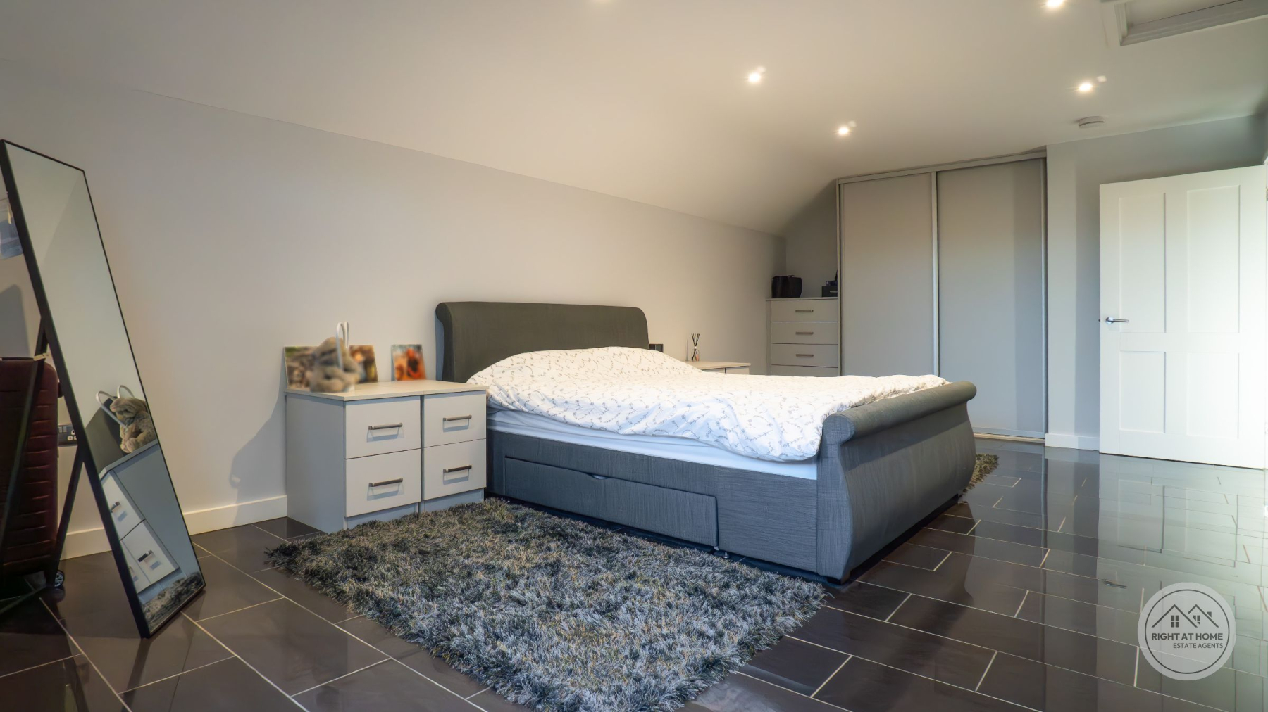 The property offers two generously proportioned bedrooms, both benefiting from built-in wardrobes and direct access to the rear courtyard via full-height glazing. The principal bedroom enjoys the additional luxury of a stylish en-suite shower room, while the second bedroom is particularly impressive in scale, extending to approximately 25ft and offering excellent versatility. A separate family shower room serves guests and the second bedroom, finished with contemporary suites including low-level WC, pedestal washbasin and rainfall shower head. Further features include attic access via the principal bedroom, private drainage, solar panels and an electric vehicle charging point, adding to the home's modern efficiency and sustainability credentials. The property is also offered with no onward chain, ensuring a straightforward purchase.