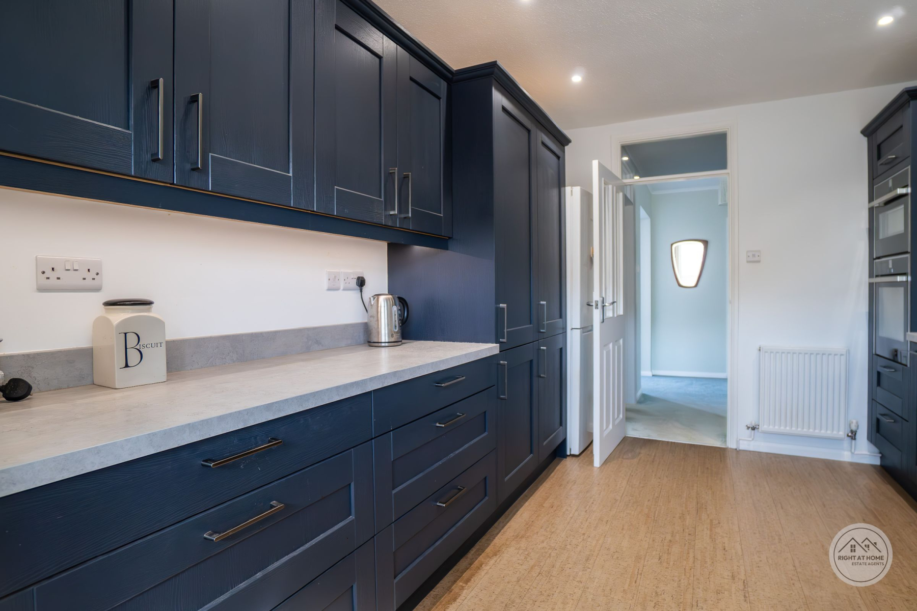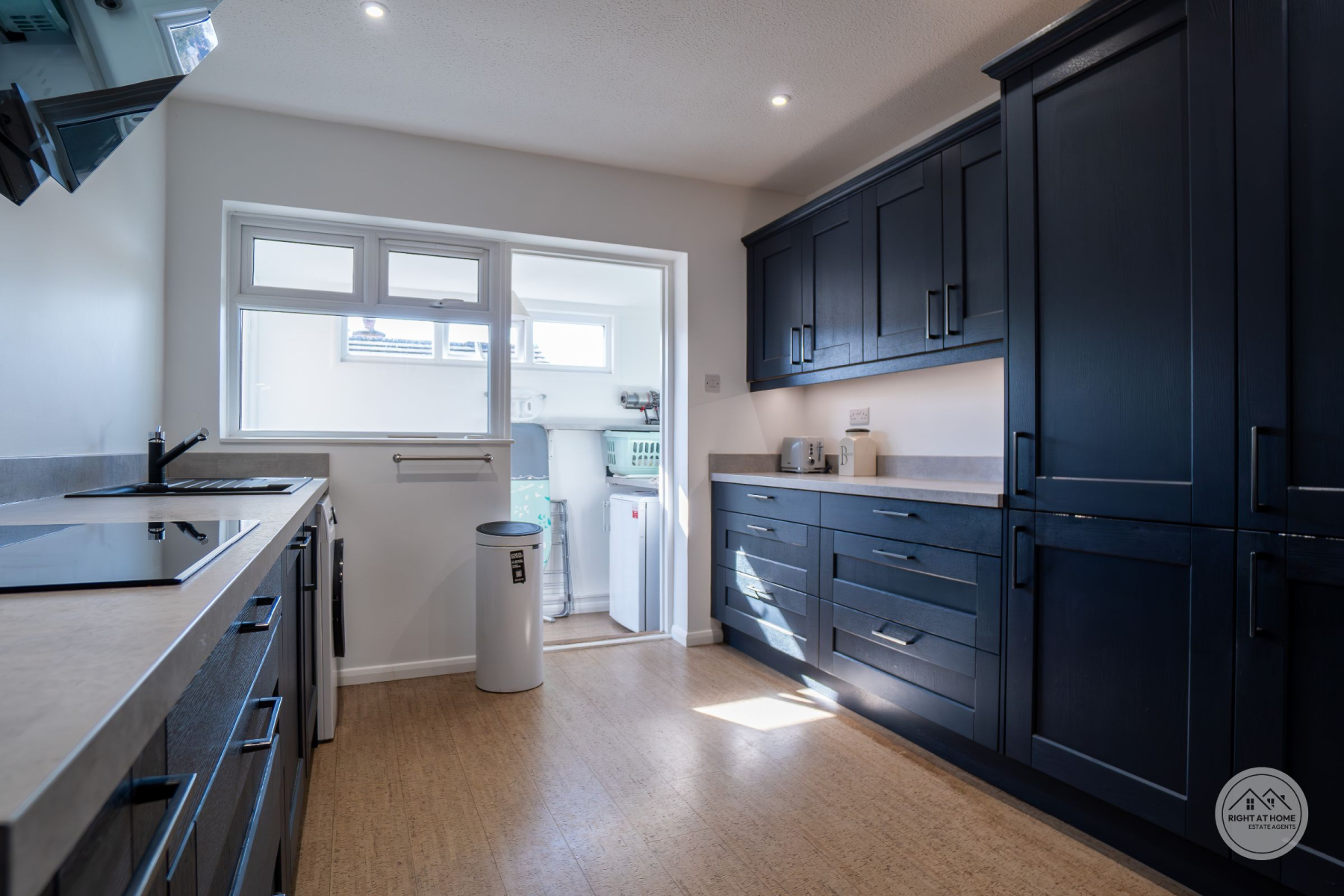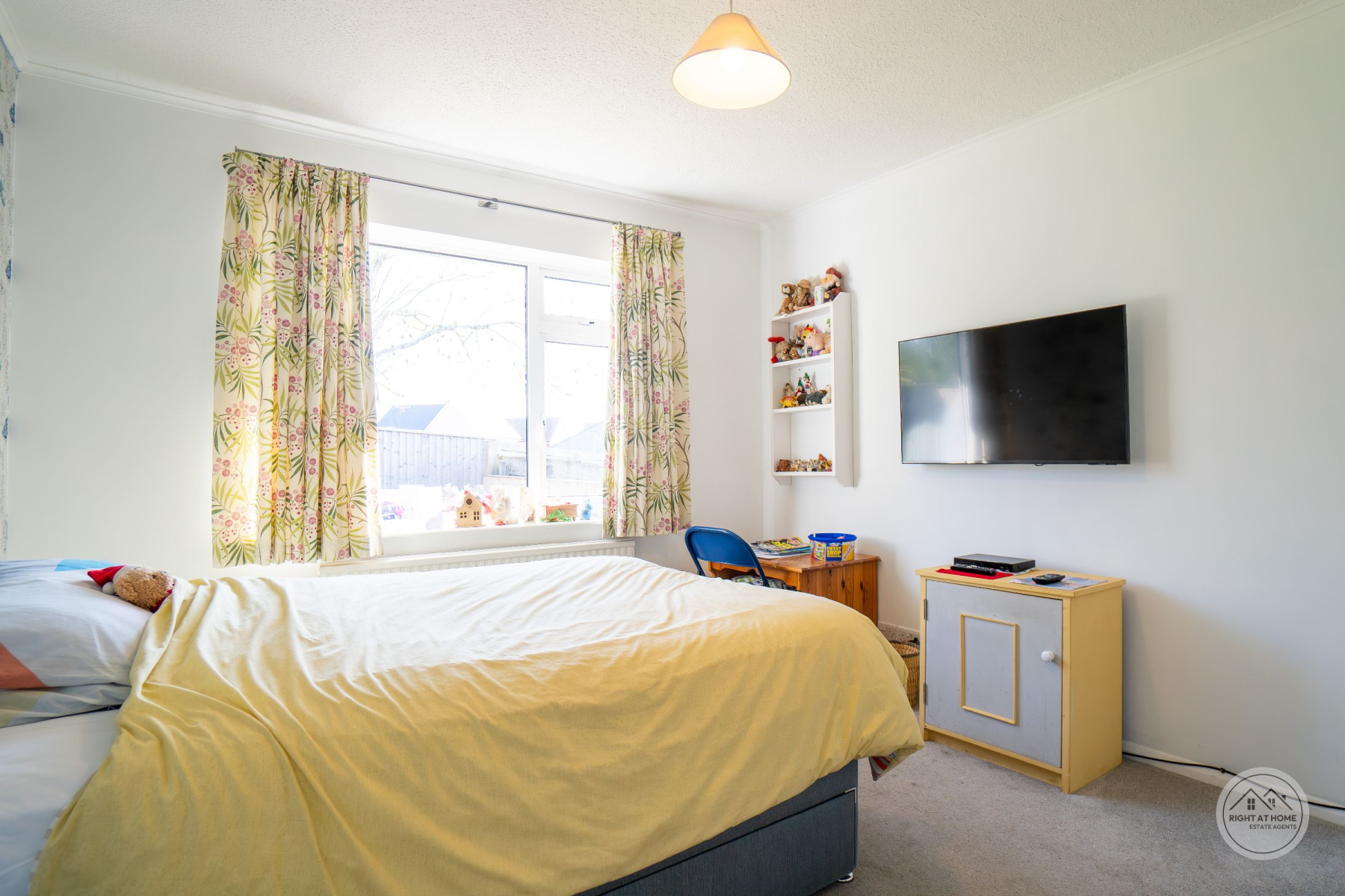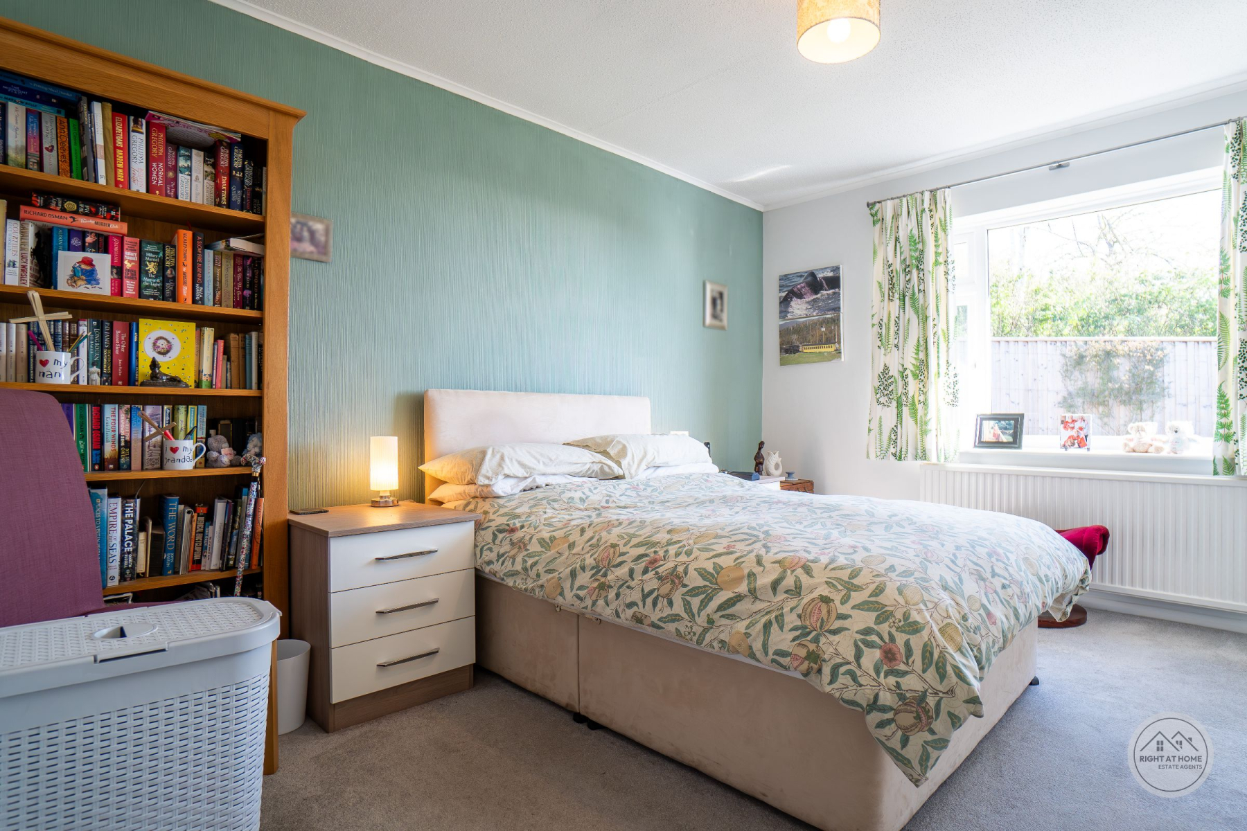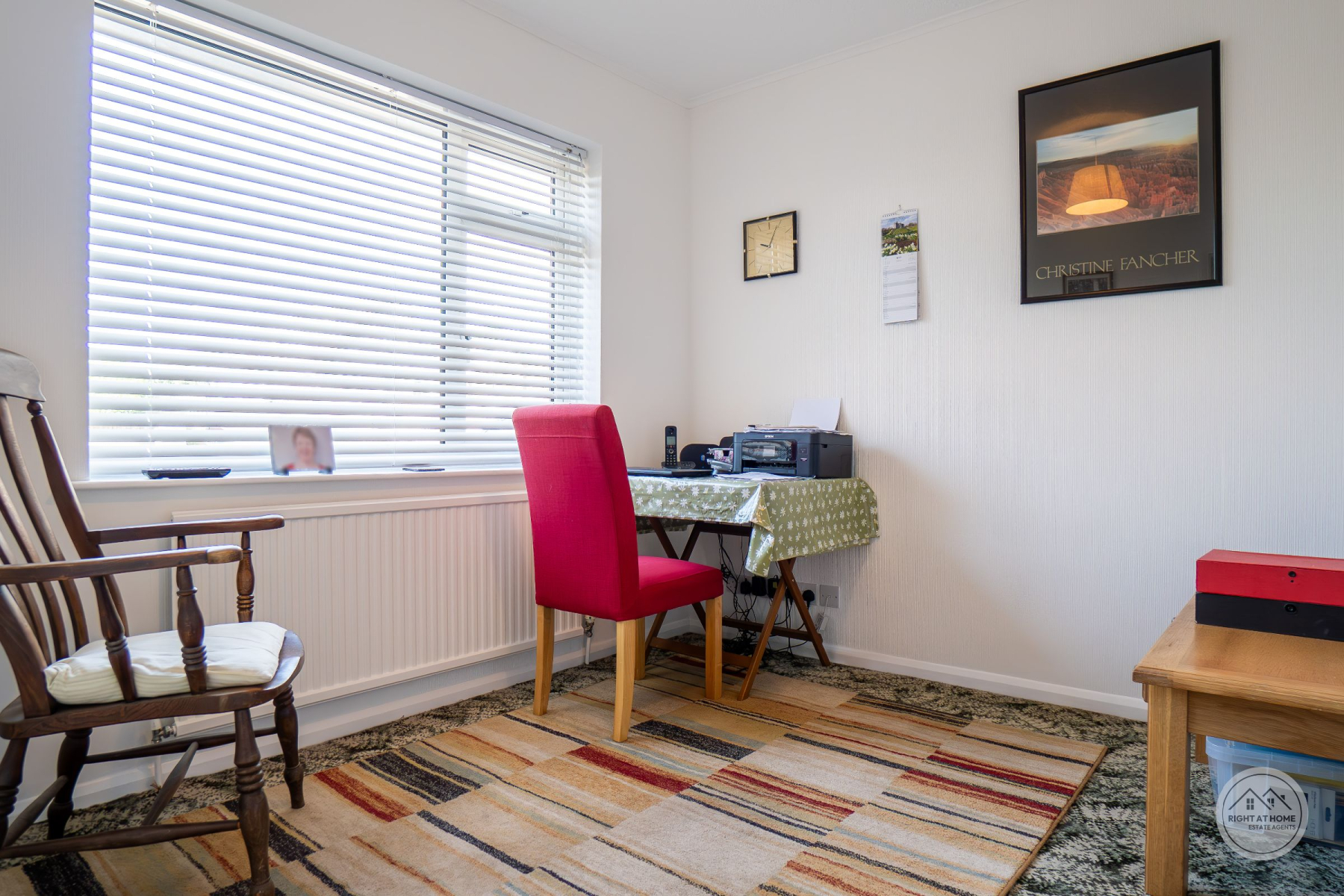 The accommodation is well arranged, comprising two generous double bedrooms positioned to the rear of the property and a single bedroom to the front, with the principal bedroom benefiting from built-in wardrobes. A bright and well-appointed kitchen leads through to a useful utility area, adding to the home's functionality. The layout and design set this bungalow apart from others in the area, offering a sense of individuality rarely found on the estate.