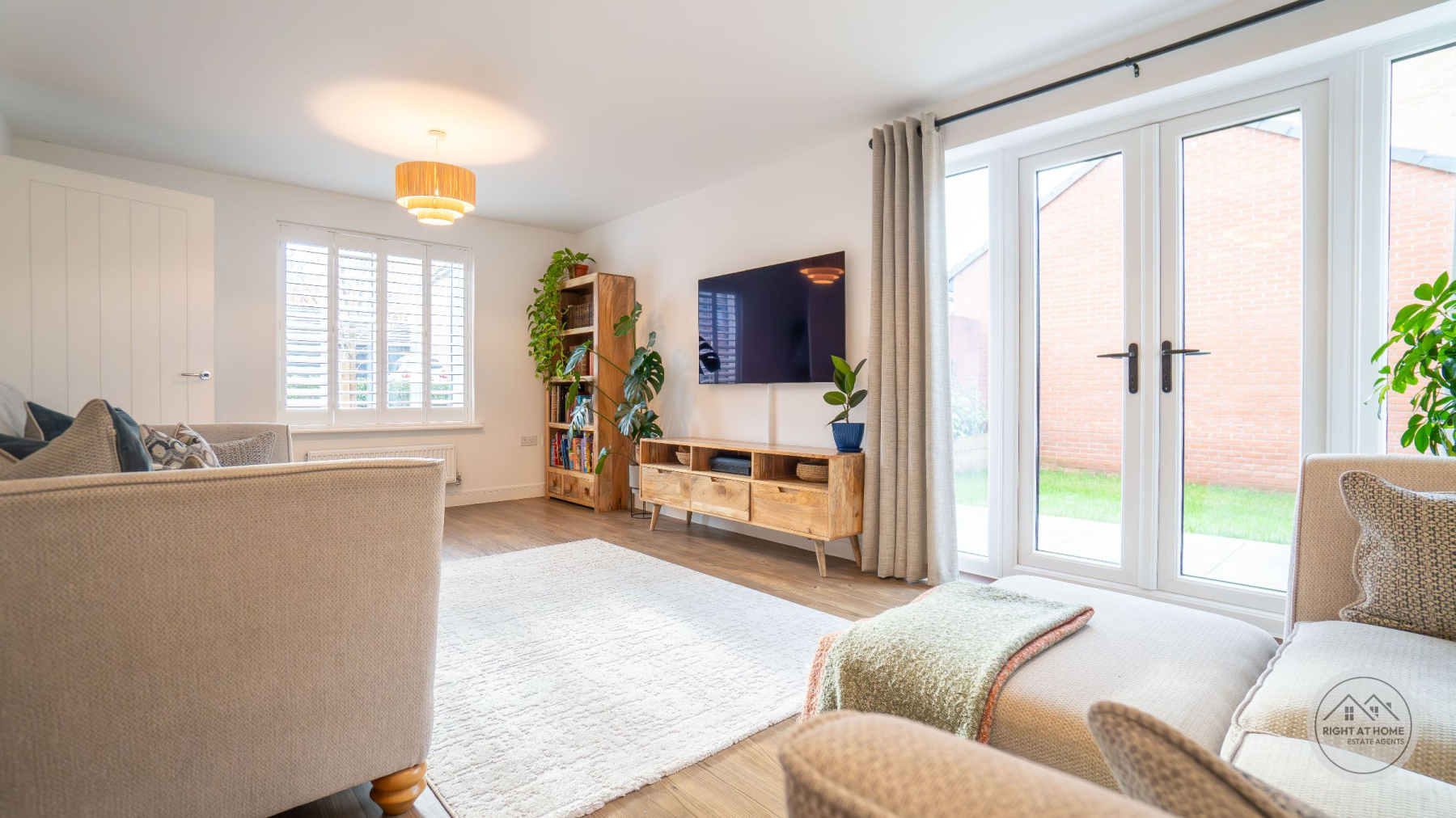 A newly enclosed rear garden offers a secure and peaceful outdoor area, featuring a patio space, grassed lawn and a composite decking area, allowing for versatile outdoor living, play and alfresco dining. Additional convenience is provided by the understairs storage cupboard, a double driveway with an electric EV charger, and a garage offering ample parking and extra storage. The entire home benefits from fitted window shutters, adding style, privacy and energy efficiency. Heating is supplied through E.ON district heating, offering reliable and efficient warmth throughout the property.