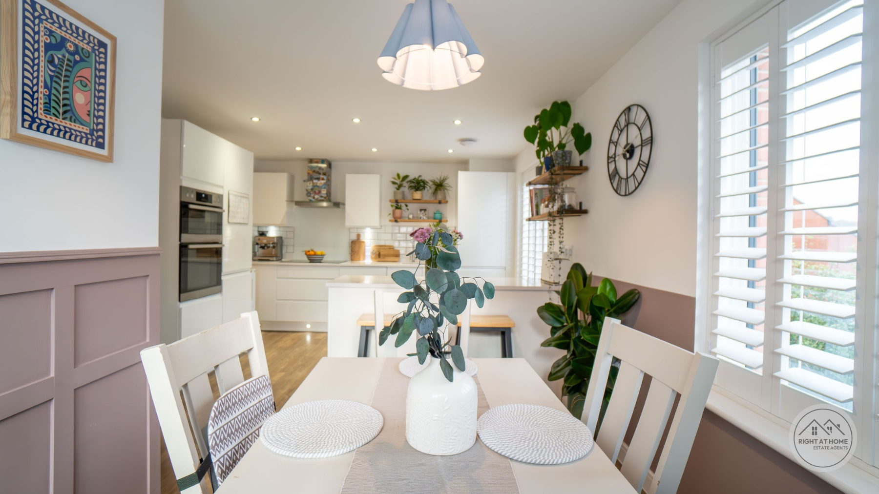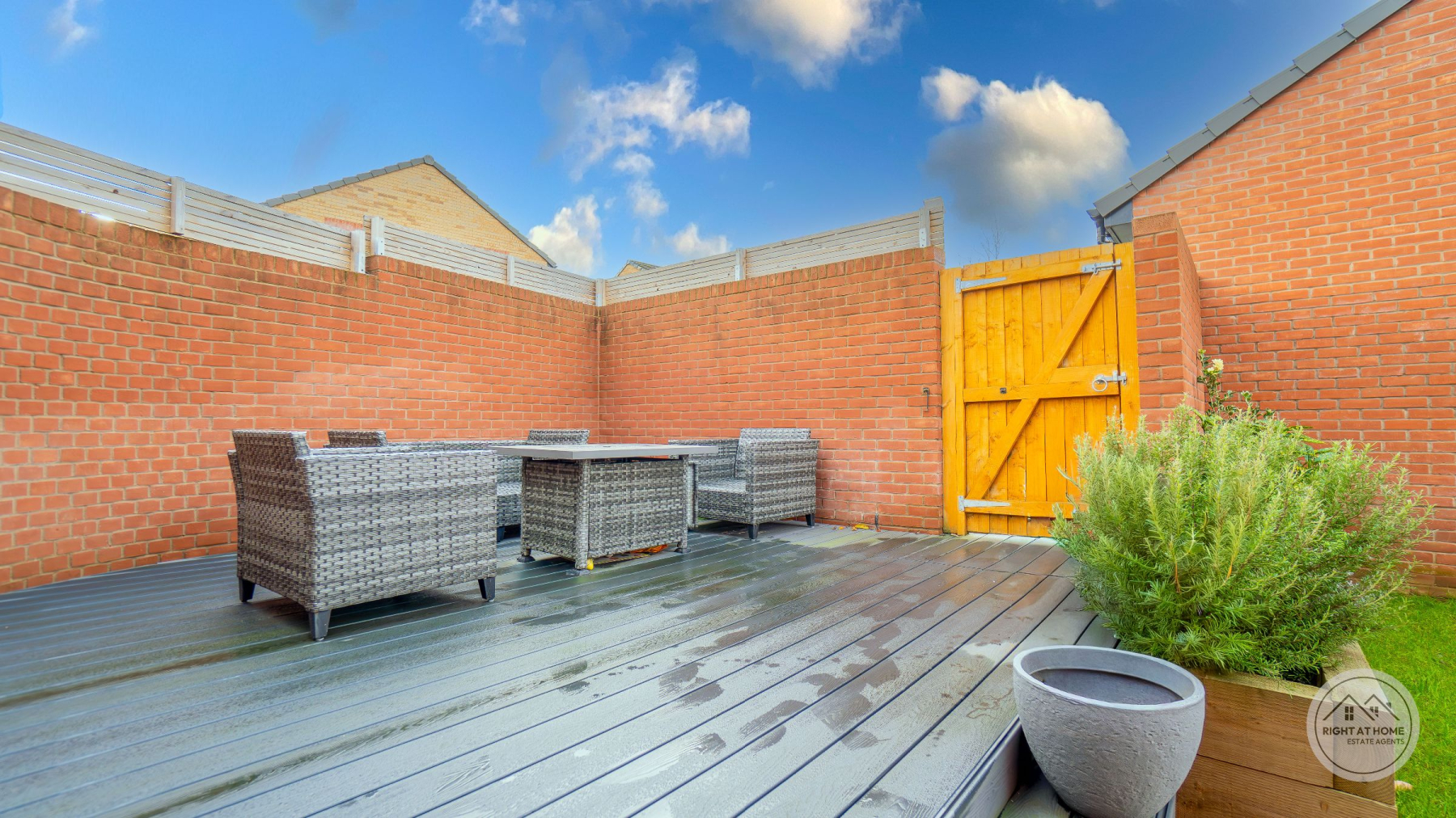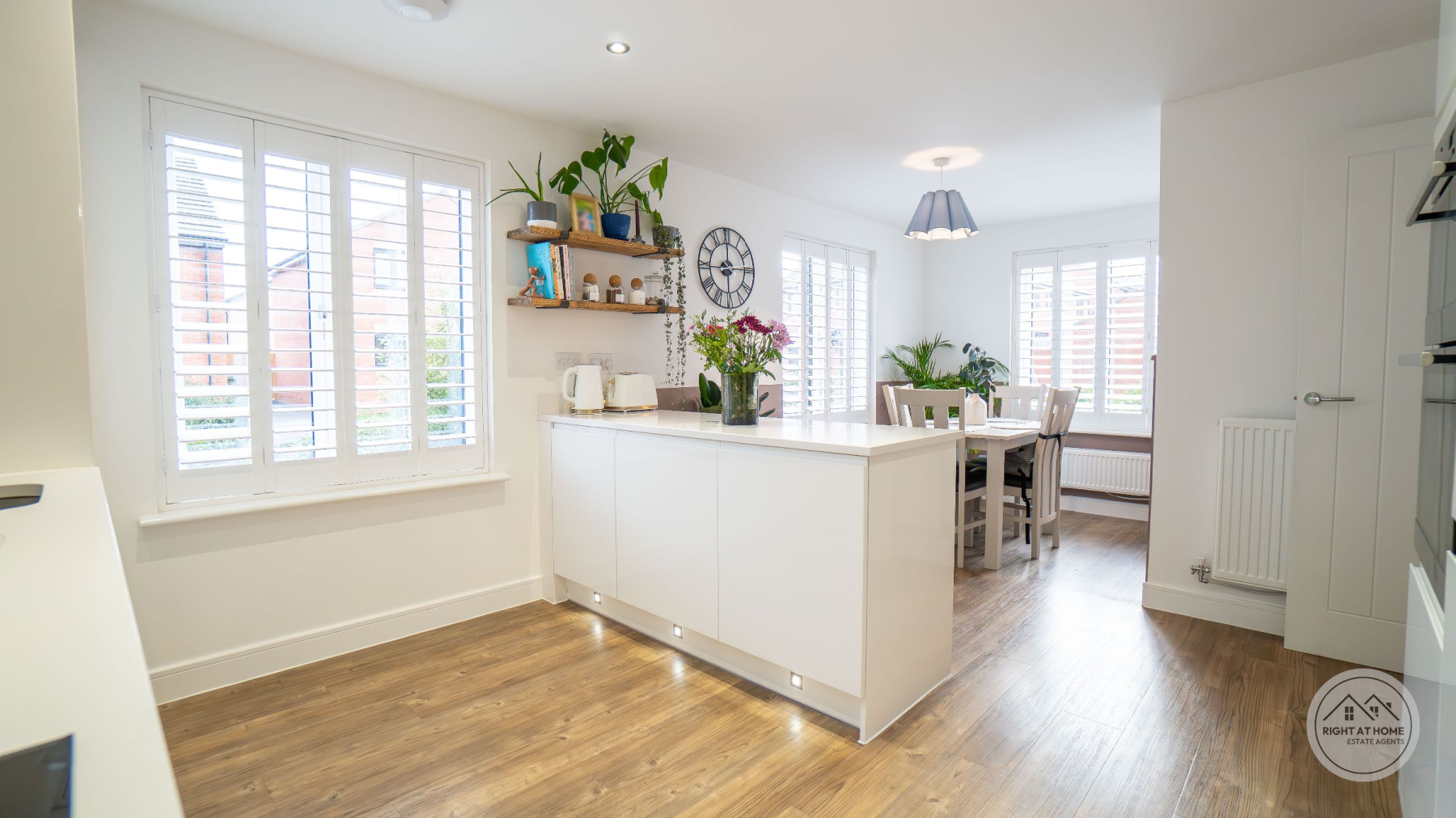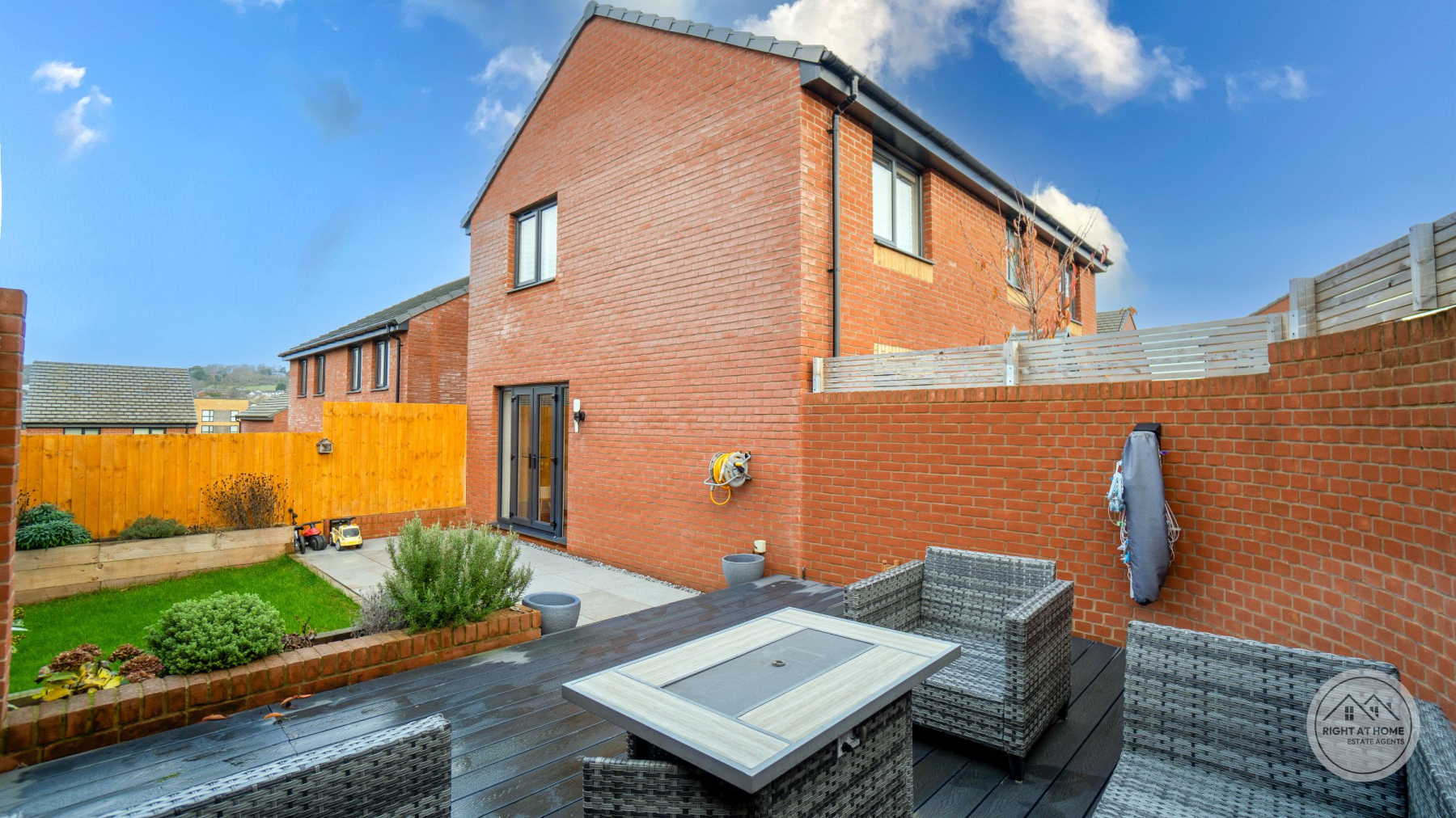 A newly enclosed, south facing rear garden offers a secure and peaceful outdoor area, featuring a patio space, grassed lawn and a composite decking area, allowing for versatile outdoor living, play and alfresco dining. Additional convenience is provided by the understairs storage cupboard, a double driveway with an electric EV charger, and a garage offering ample parking and extra storage. The entire home benefits from fitted window shutters, adding style, privacy and energy efficiency. Heating is supplied through E.ON district heating, offering reliable and efficient warmth throughout the property.