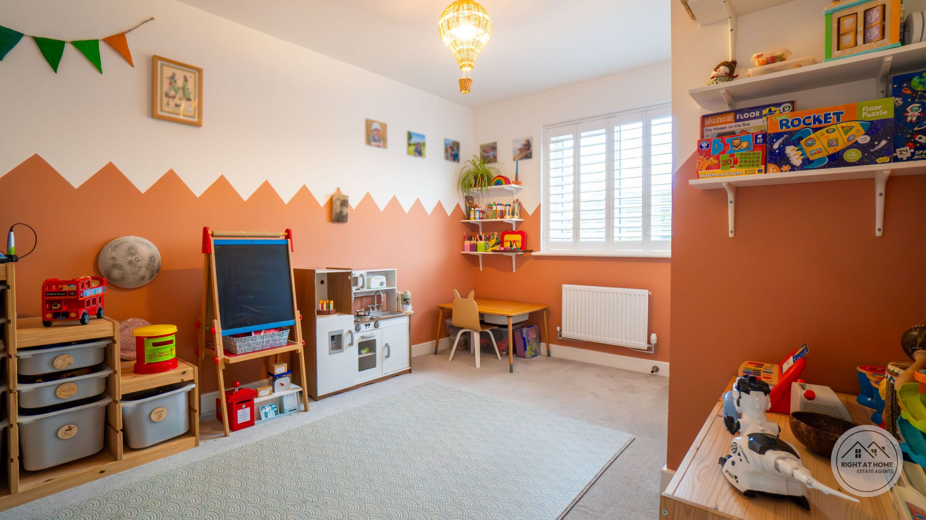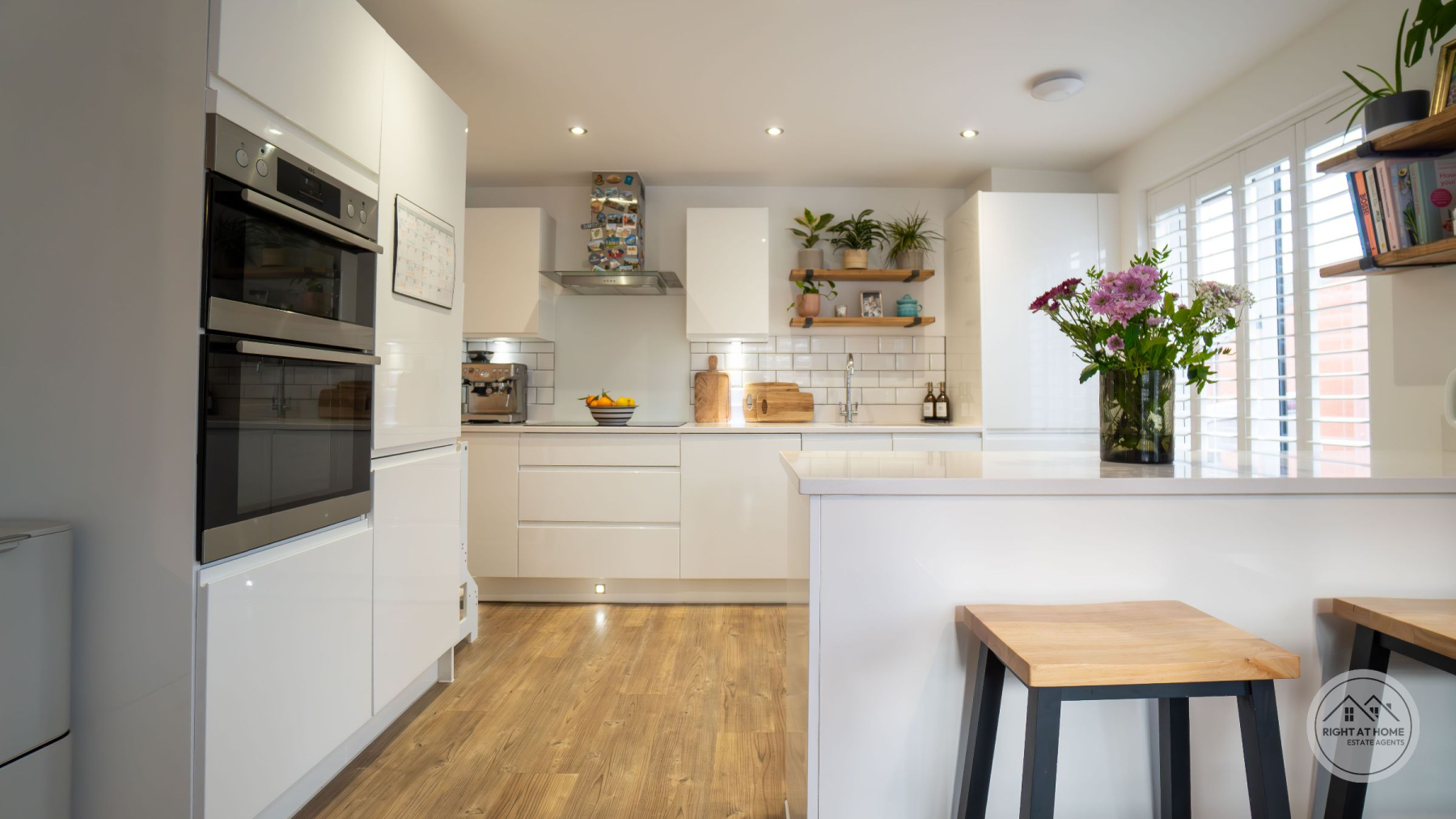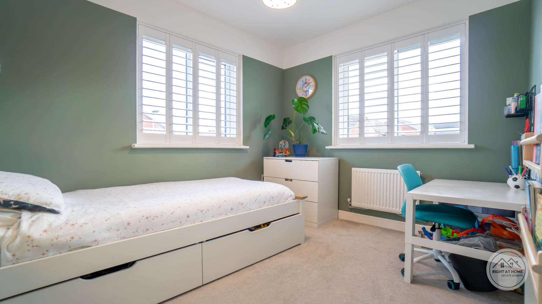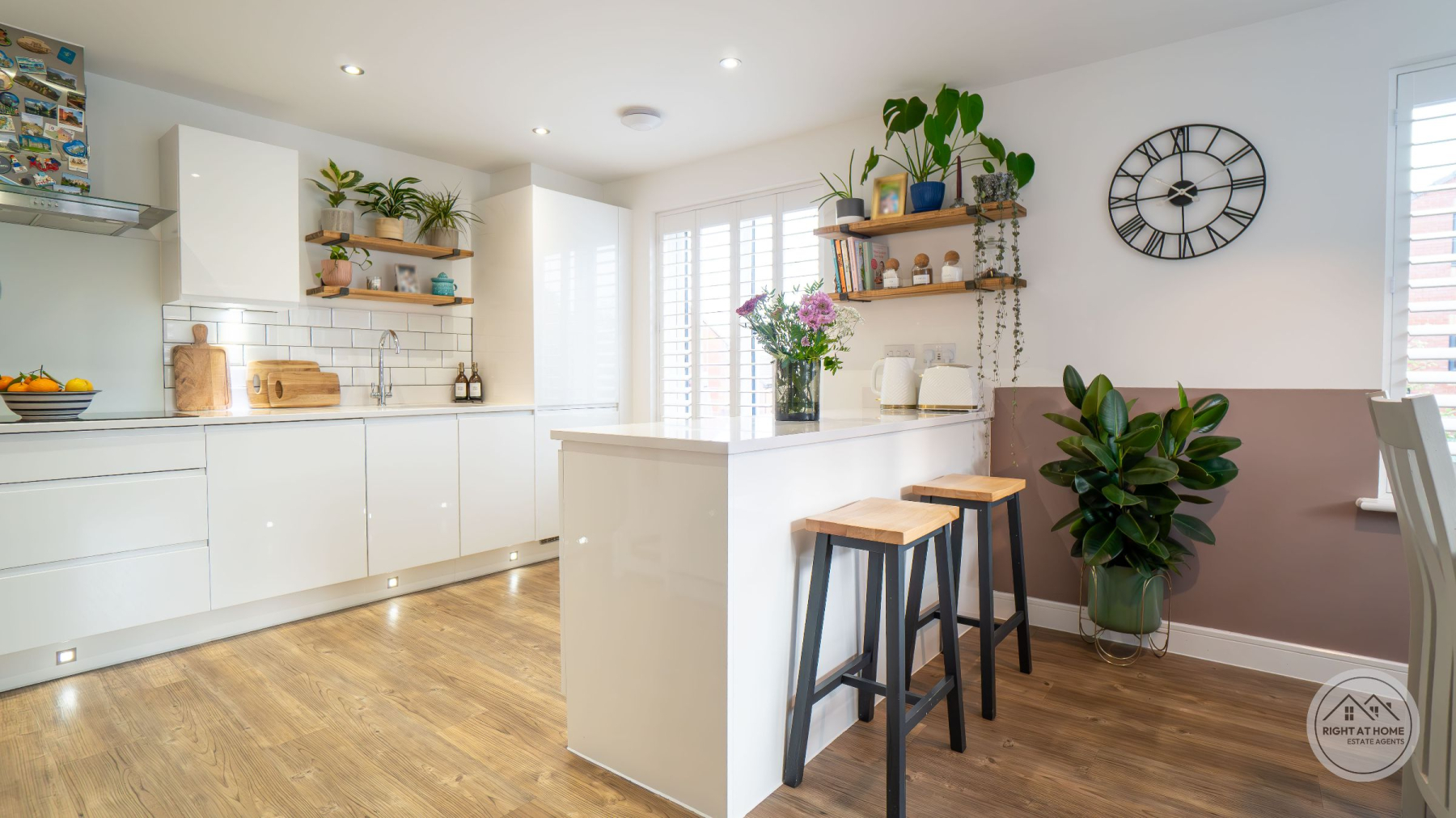 A newly enclosed, south facing rear garden offers a secure and peaceful outdoor area, featuring a patio space, grassed lawn and a composite decking area, allowing for versatile outdoor living, play and alfresco dining. Additional convenience is provided by the understairs storage cupboard, a double driveway with an electric EV charger, and a garage offering ample parking and extra storage. The entire home benefits from fitted window shutters, adding style, privacy and energy efficiency. Heating is supplied through E.ON district heating, offering reliable and efficient warmth throughout the property.