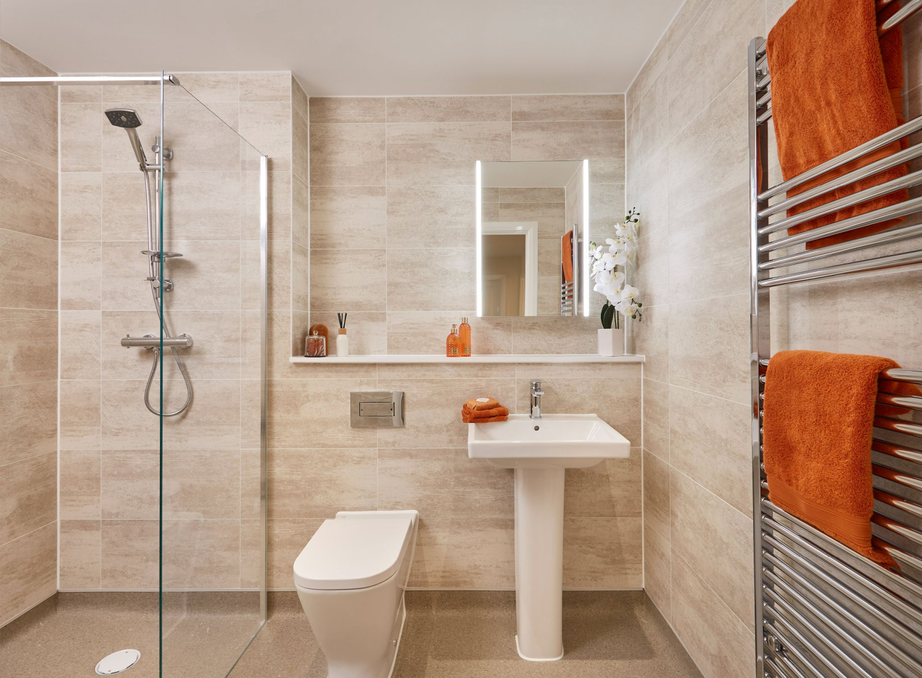 The spacious double bedroom includes fitted wardrobes providing excellent storage. The apartment also offers a contemporary level-access walk-in shower room designed for both comfort and safety, featuring slip-resistant Tarkett Granit Safe flooring in Dark Sand combined with Amtico First Sun Bleached Oak flooring, together with a heated towel rail.
