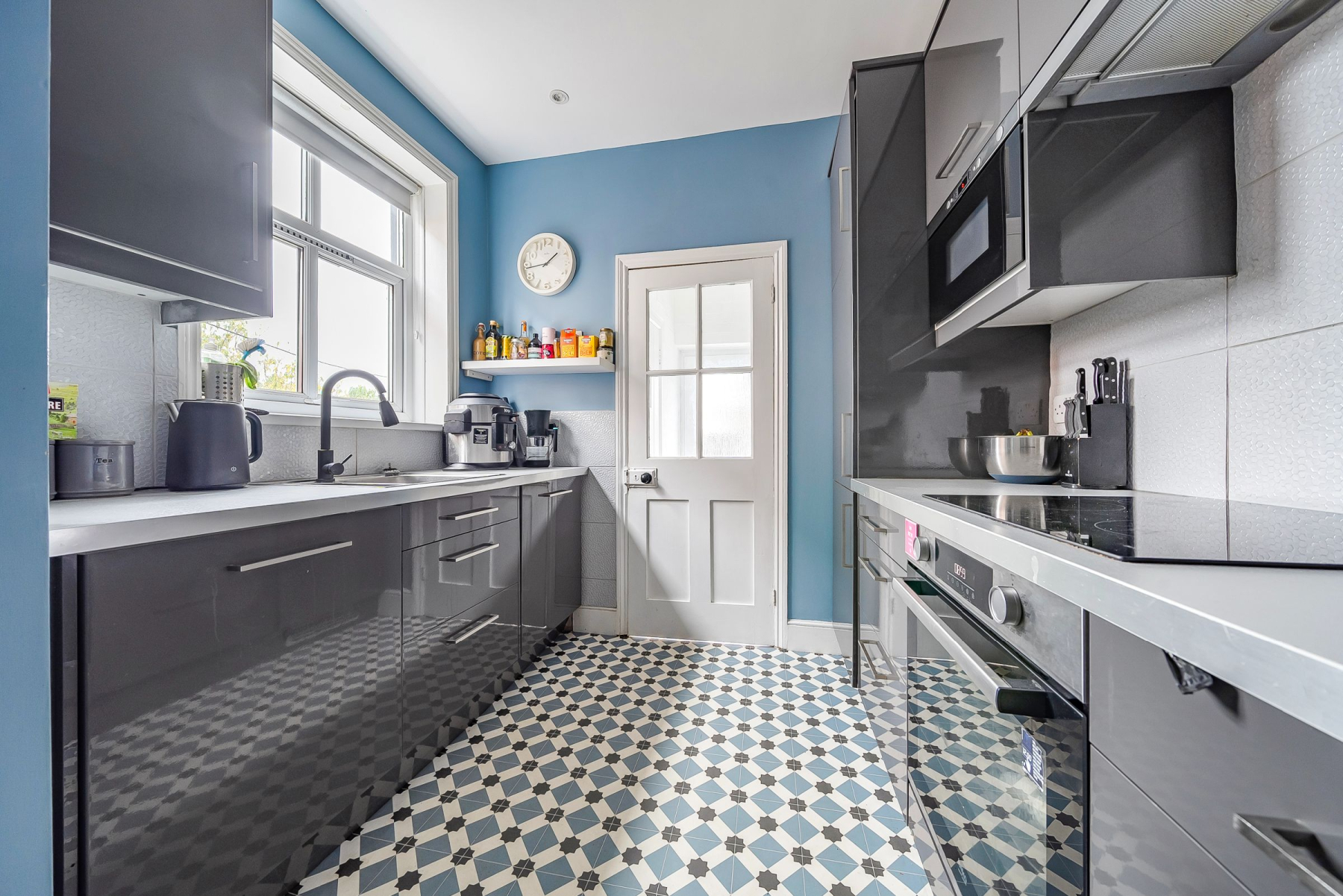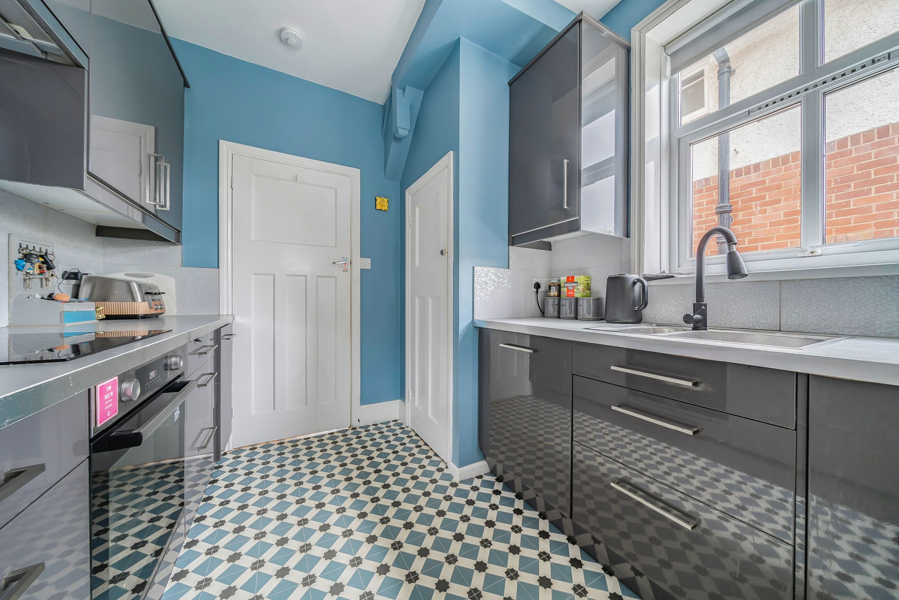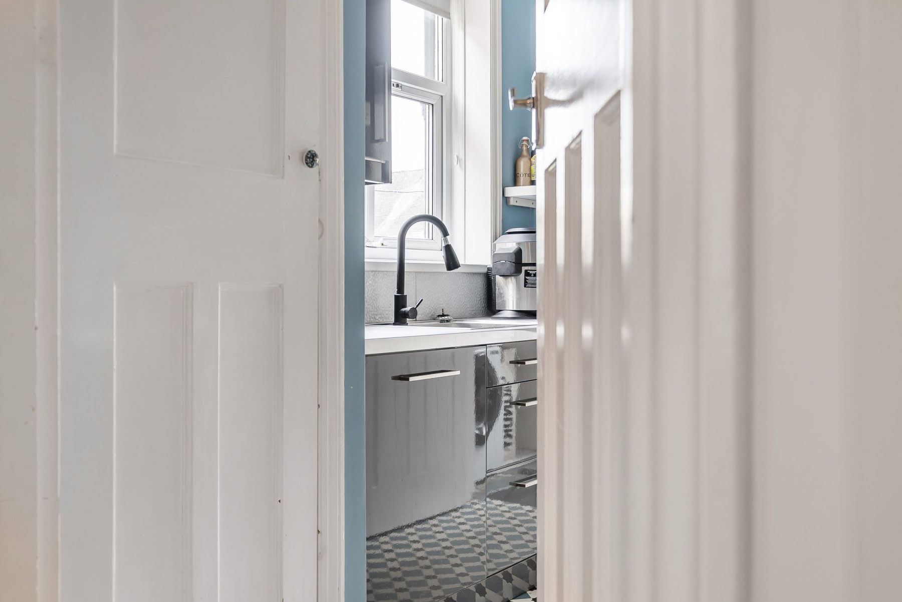 Original cupboards. Space for dining table, doorway through to study/bedroom, underfloor heating.