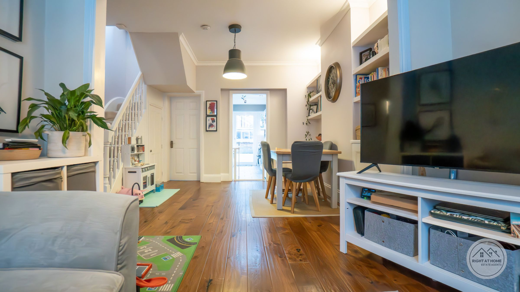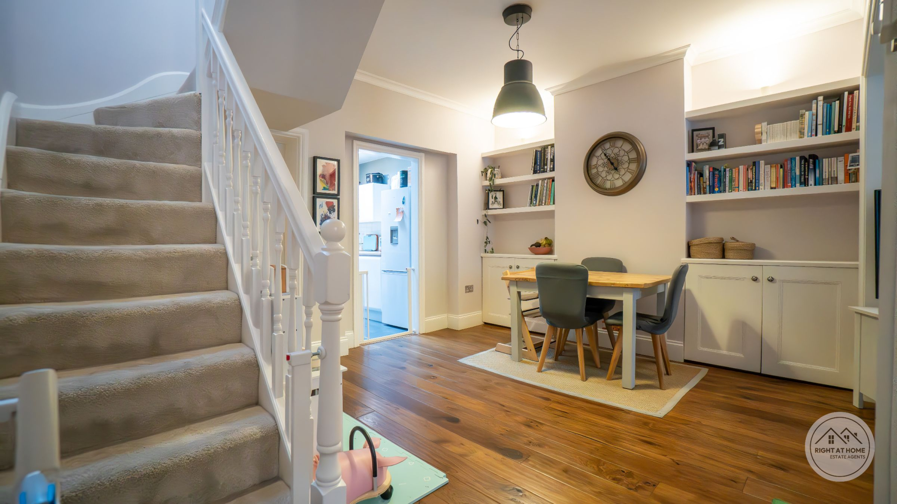 The home further benefits from excellent storage solutions, including built-in understairs pull-out drawers for shoes, bespoke fitted wardrobes in both bedrooms, and fitted cupboards within the dining area. The loft is fully boarded and accessed via a built-in ladder, providing additional practical storage space. Externally, there is an enclosed rear garden, ideal for both relaxing and entertaining, with the added benefit of electricity connected to the shed.