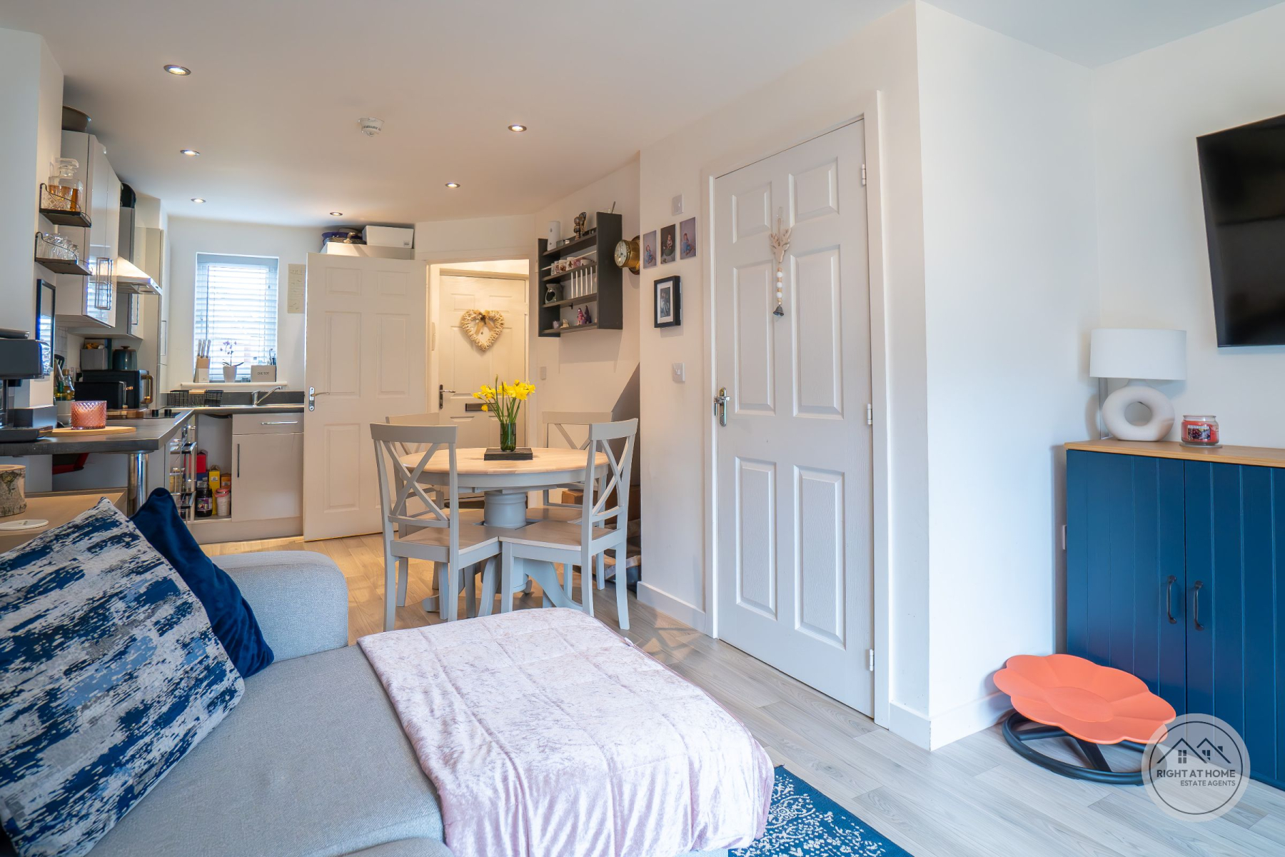The property features a bright and spacious open-plan living area, perfect for both everyday family life and entertaining. The contemporary layout flows seamlessly through the ground floor, complemented by a convenient downstairs WC. Upstairs, you'll find three well-proportioned bedrooms and a modern family bathroom. The master bedroom benefits from bespoke fitted wardrobes, providing excellent storage while maintaining a sleek finish.